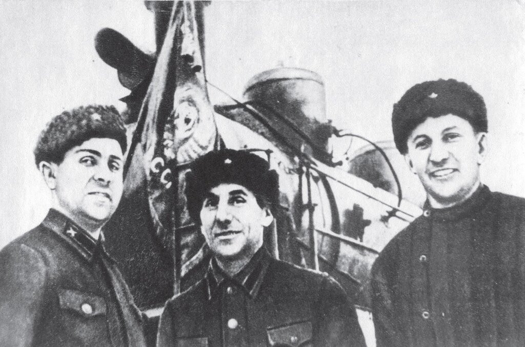 052 Бригада, завоевавшая право провести первый поезд из Ленинграда на «Большую землю». Слева направо