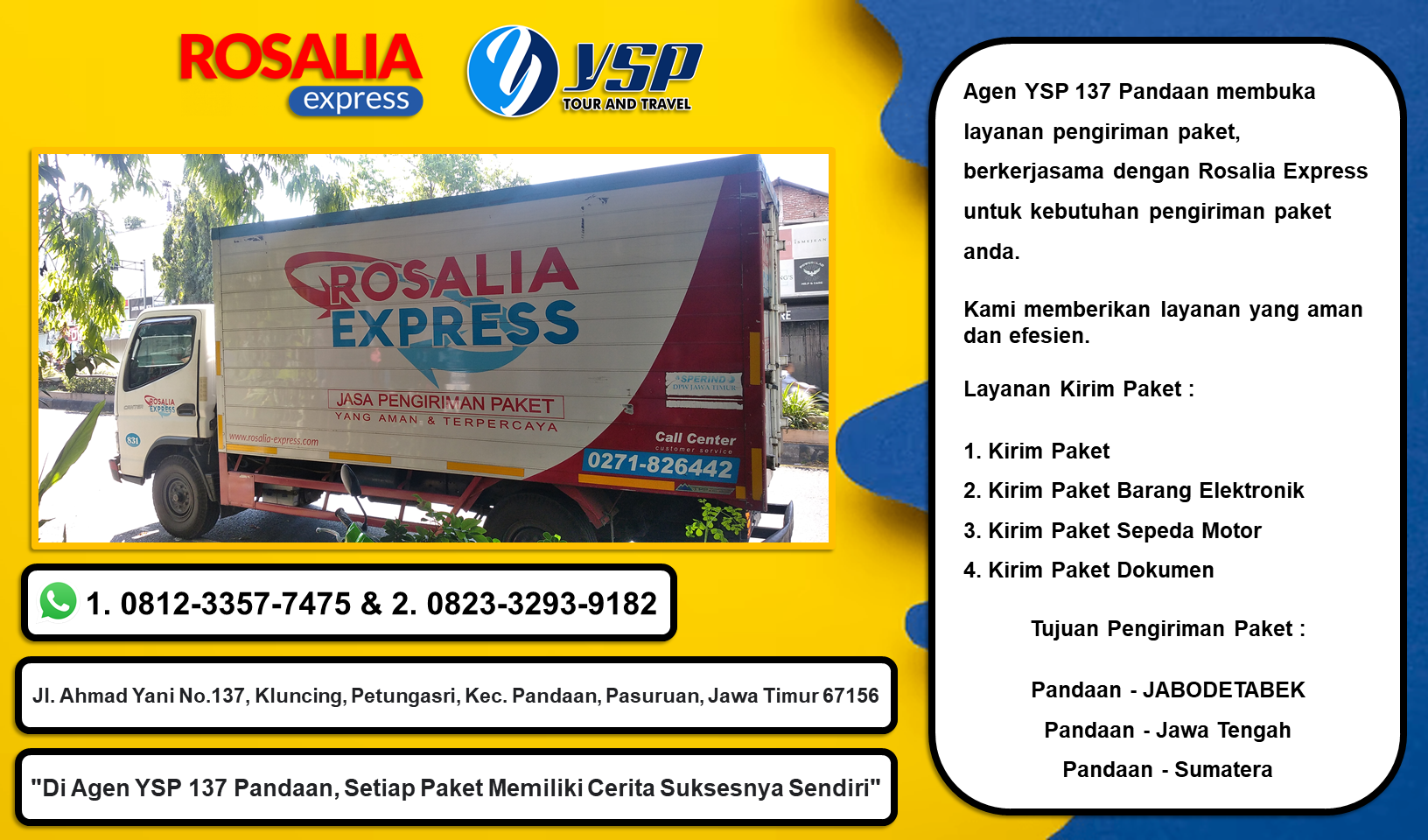Agen YSP 137 Pandaan membuka layanan pengiriman paket, berkerjasama dengan Rosalia Express untuk kebutuhan pengiriman paket anda.