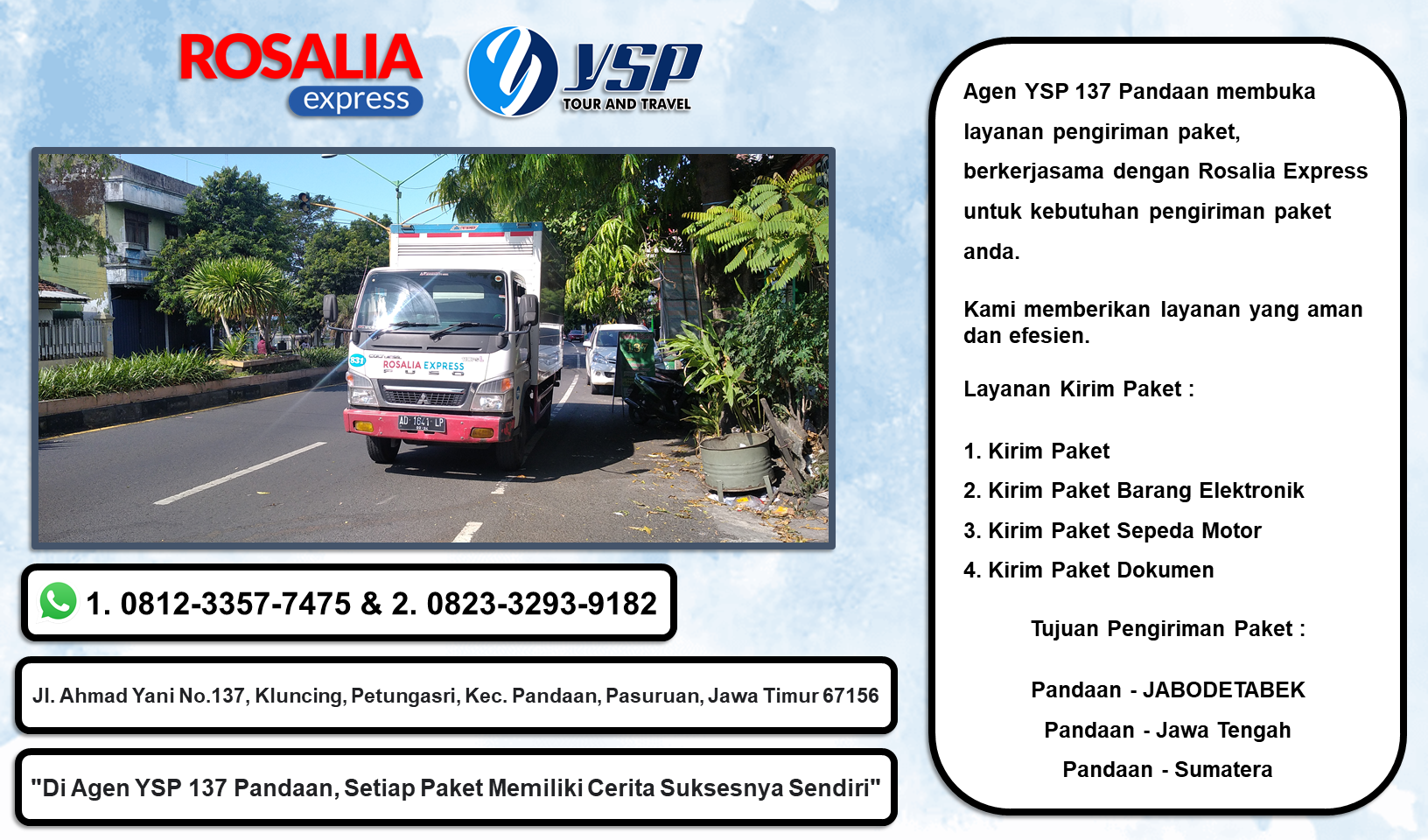 Kirim Paket Rosalia Express Pandaan Ke Batu Jamus, Kirim Paket Rosalia Express Pandaan Ke Karangpandan, Kirim Paket Rosalia Express Pandaan Ke Kaliwuluh, Kirim Paket Rosalia Express Pandaan Ke Gilingan, Kirim Paket Rosalia Express Pandaan Ke Slamet Riyadi, Kirim Paket Rosalia Express Pandaan Ke Sraten, Kirim Paket Rosalia Express Pandaan Ke Bpw Kleco, Kirim Paket Rosalia Express Pandaan Ke Veteran Serengan, Kirim Paket Rosalia Express Pandaan Ke Pasar Gede, Kirim Paket Rosalia Express Pandaan Ke Palur.Agen YSP 137 Pandaan membuka layanan pengiriman paket, berkerjasama dengan Rosalia Express untuk kebutuhan pengiriman paket anda.Kami memberikan layanan yang AMAN dan EFISIEN.Layanan Kirim Paket :1. Kirim Paket2. Kirim Paket Barang Elektronik3. Kirim Paket Sepeda Motor4. Kirim Paket Dokumen5. Kirim Paket Produk UMKMTujuan Pengiriman Paket :Pandaan - JABODETABEKPandaan - Jawa TengahPandaan - SumateraNo WA / Telpn : 0812-3357-7475Alamat : Jl. A. Yani No.137, Petungwulung, Petungasri, Kec. Pandaan, Pasuruan, Jawa Timur 67156.#ysp137pandaanpaket #ysp137pandaankirimpaket #kirimpaketsepedamotor #kirimpaketsepedakota #kirimpaketdokumen #kirimpaketelekronik #kirimpaketprodukumkm
