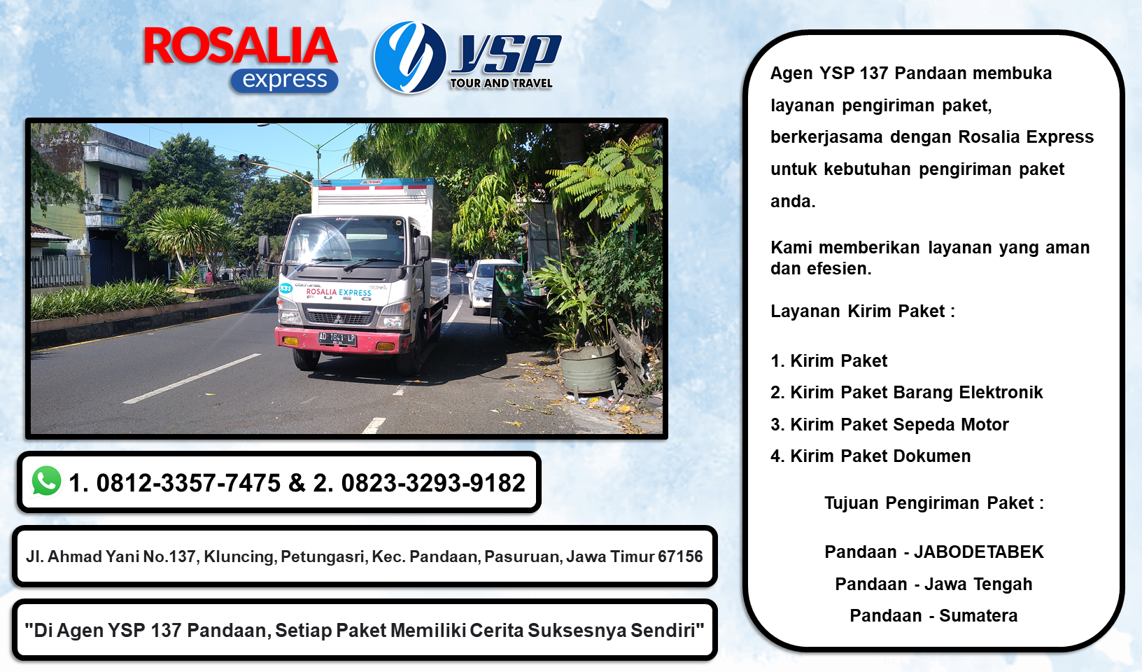 Kirim Paket Rosalia Express Pandaan Ke Batu Jamus, Kirim Paket Rosalia Express Pandaan Ke Karangpandan, Kirim Paket Rosalia Express Pandaan Ke Kaliwuluh, Kirim Paket Rosalia Express Pandaan Ke Gilingan, Kirim Paket Rosalia Express Pandaan Ke Slamet Riyadi, Kirim Paket Rosalia Express Pandaan Ke Sraten, Kirim Paket Rosalia Express Pandaan Ke Bpw Kleco, Kirim Paket Rosalia Express Pandaan Ke Veteran Serengan, Kirim Paket Rosalia Express Pandaan Ke Pasar Gede, Kirim Paket Rosalia Express Pandaan Ke Palur.Agen YSP 137 Pandaan membuka layanan pengiriman paket, berkerjasama dengan Rosalia Express untuk kebutuhan pengiriman paket anda.Kami memberikan layanan yang AMAN dan EFISIEN.Layanan Kirim Paket :1. Kirim Paket2. Kirim Paket Barang Elektronik3. Kirim Paket Sepeda Motor4. Kirim Paket Dokumen5. Kirim Paket Produk UMKMTujuan Pengiriman Paket :Pandaan - JABODETABEKPandaan - Jawa TengahPandaan - SumateraNo WA / Telpn : 0812-3357-7475Alamat : Jl. A. Yani No.137, Petungwulung, Petungasri, Kec. Pandaan, Pasuruan, Jawa Timur 67156.#ysp137pandaanpaket #ysp137pandaankirimpaket #kirimpaketsepedamotor #kirimpaketsepedakota #kirimpaketdokumen #kirimpaketelekronik #kirimpaketprodukumkm