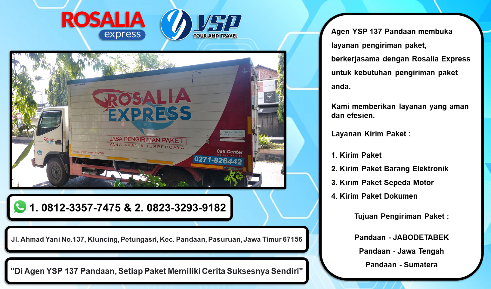 Agen YSP 137 Pandaan membuka layanan pengiriman paket, berkerjasama dengan Rosalia Express untuk kebutuhan pengiriman paket anda.