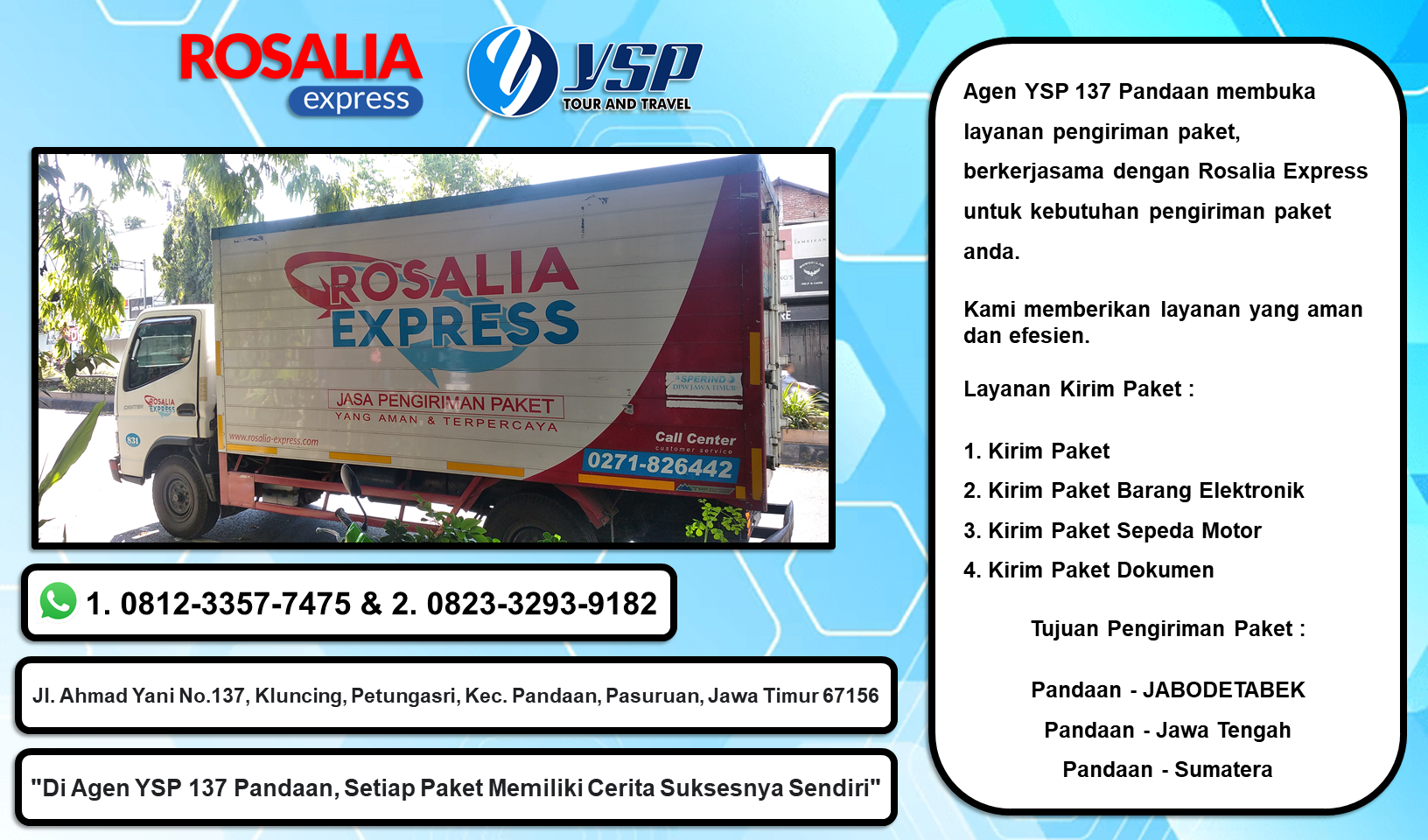 Agen YSP 137 Pandaan membuka layanan pengiriman paket, berkerjasama dengan Rosalia Express untuk kebutuhan pengiriman paket anda.