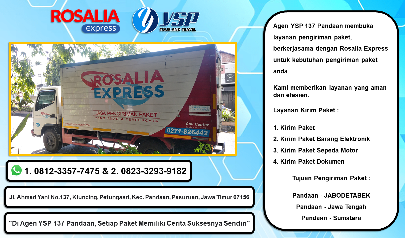 Agen YSP 137 Pandaan membuka layanan pengiriman paket, berkerjasama dengan Rosalia Express untuk kebutuhan pengiriman paket anda.