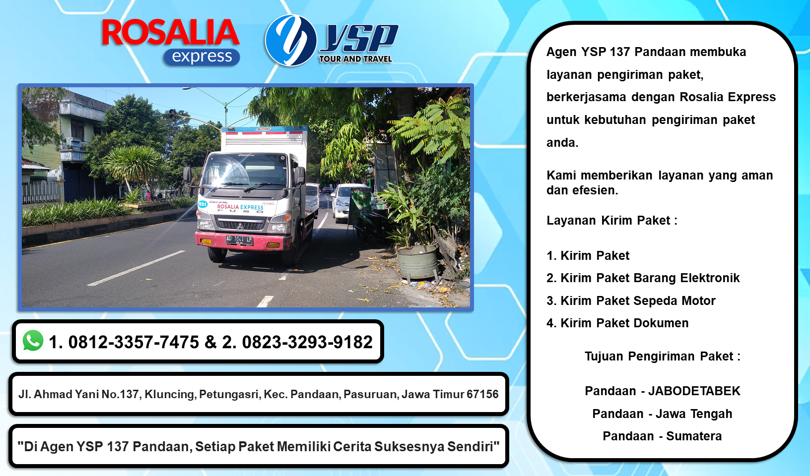 Agen YSP 137 Pandaan membuka layanan pengiriman paket, berkerjasama dengan Rosalia Express untuk kebutuhan pengiriman paket anda.