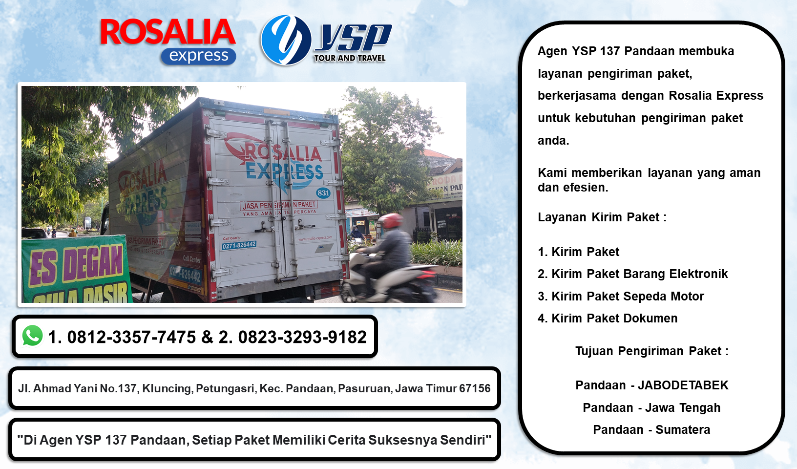 Agen YSP 137 Pandaan membuka layanan pengiriman paket, berkerjasama dengan Rosalia Express untuk kebutuhan pengiriman paket anda.