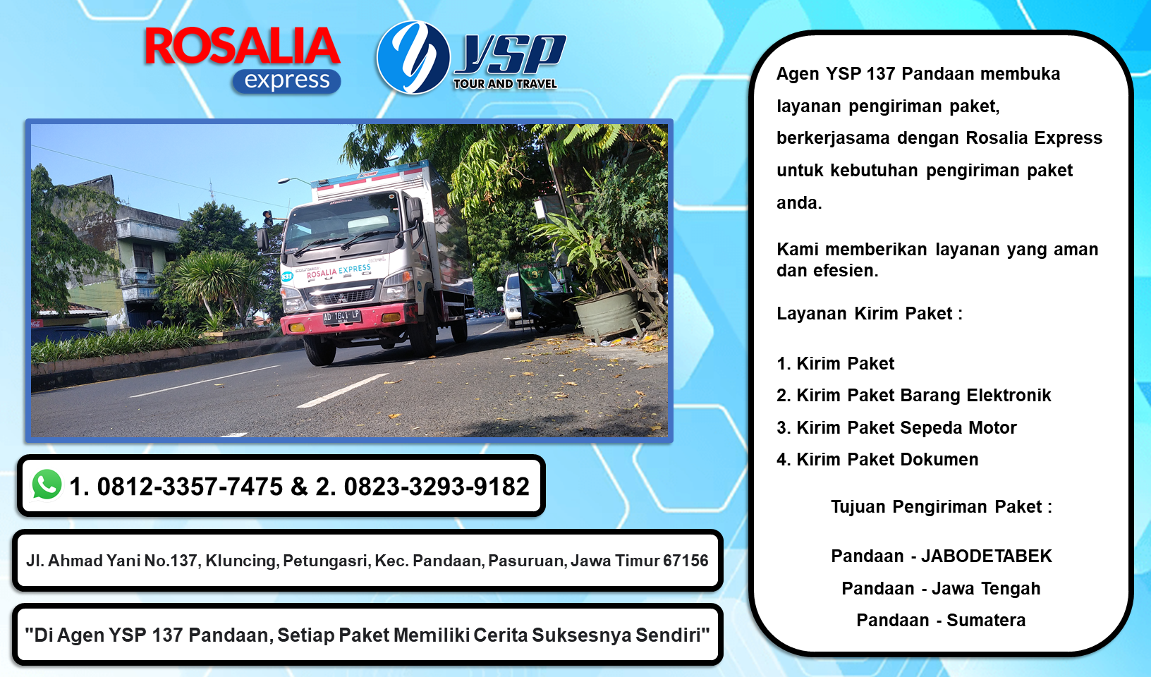 Agen YSP 137 Pandaan membuka layanan pengiriman paket, berkerjasama dengan Rosalia Express untuk kebutuhan pengiriman paket anda.
