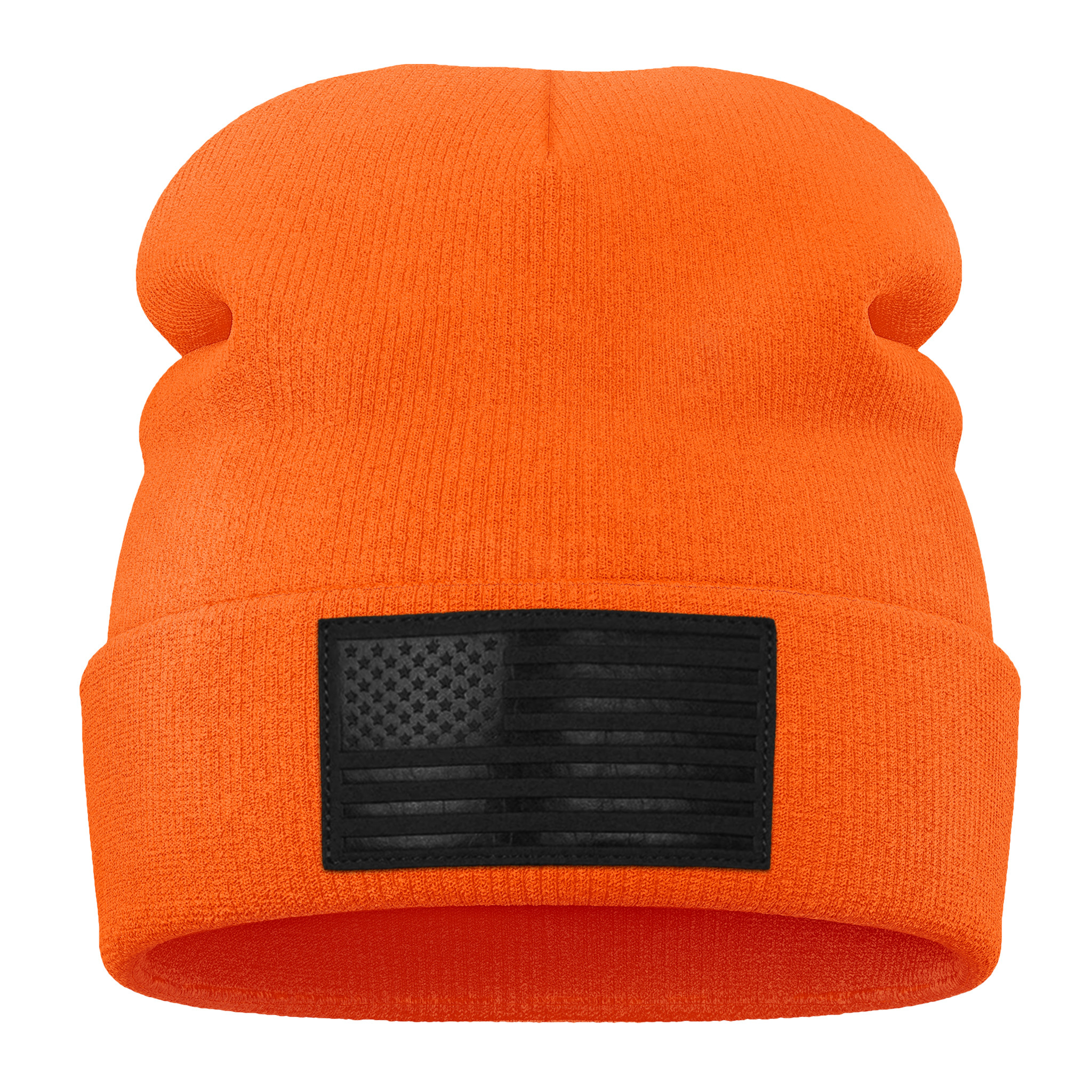 1 Beanie Front Neon Orange Black Leather Flag Patch