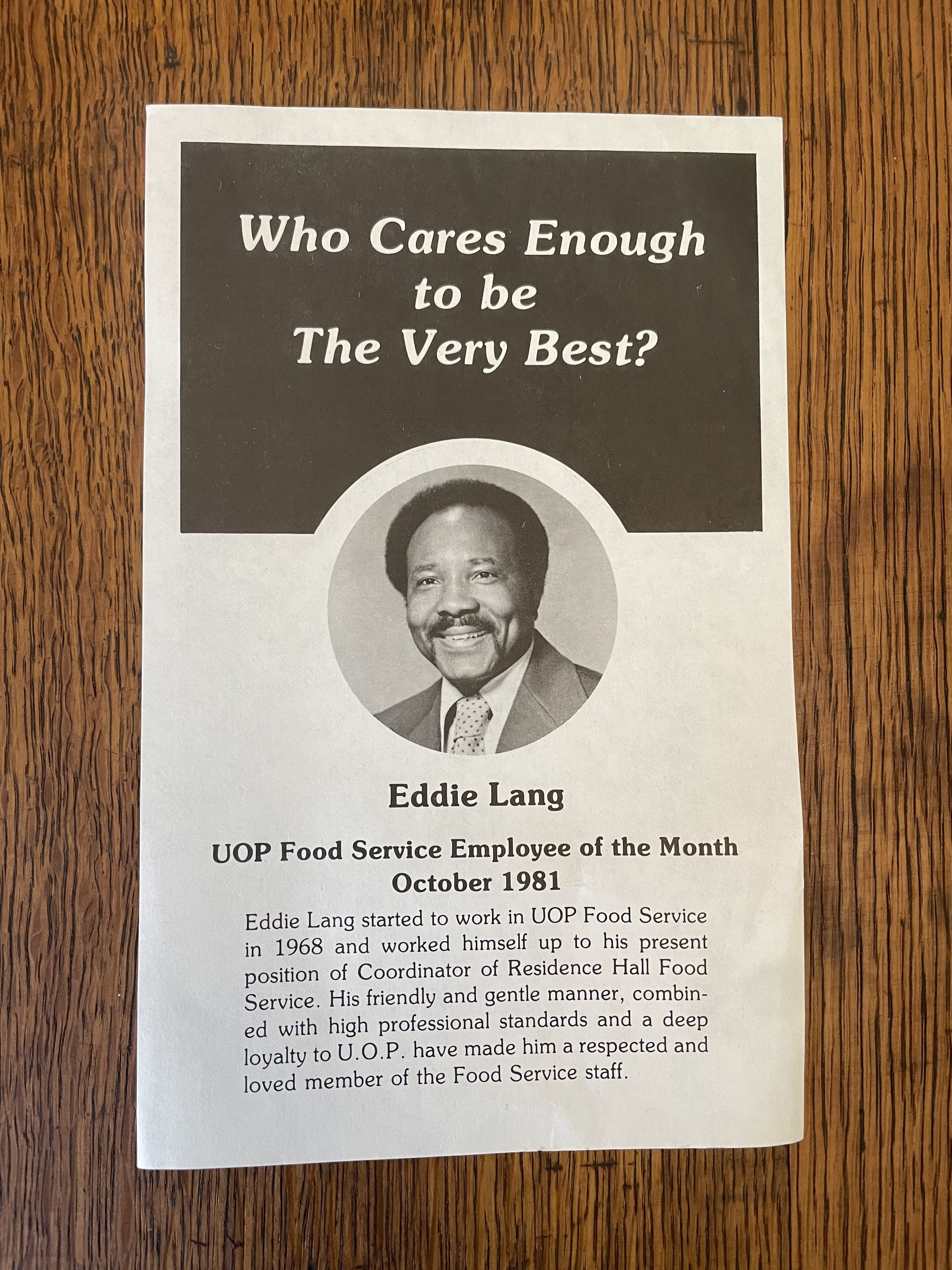 Flyer of food service staff member placed monthly on all dining tables
