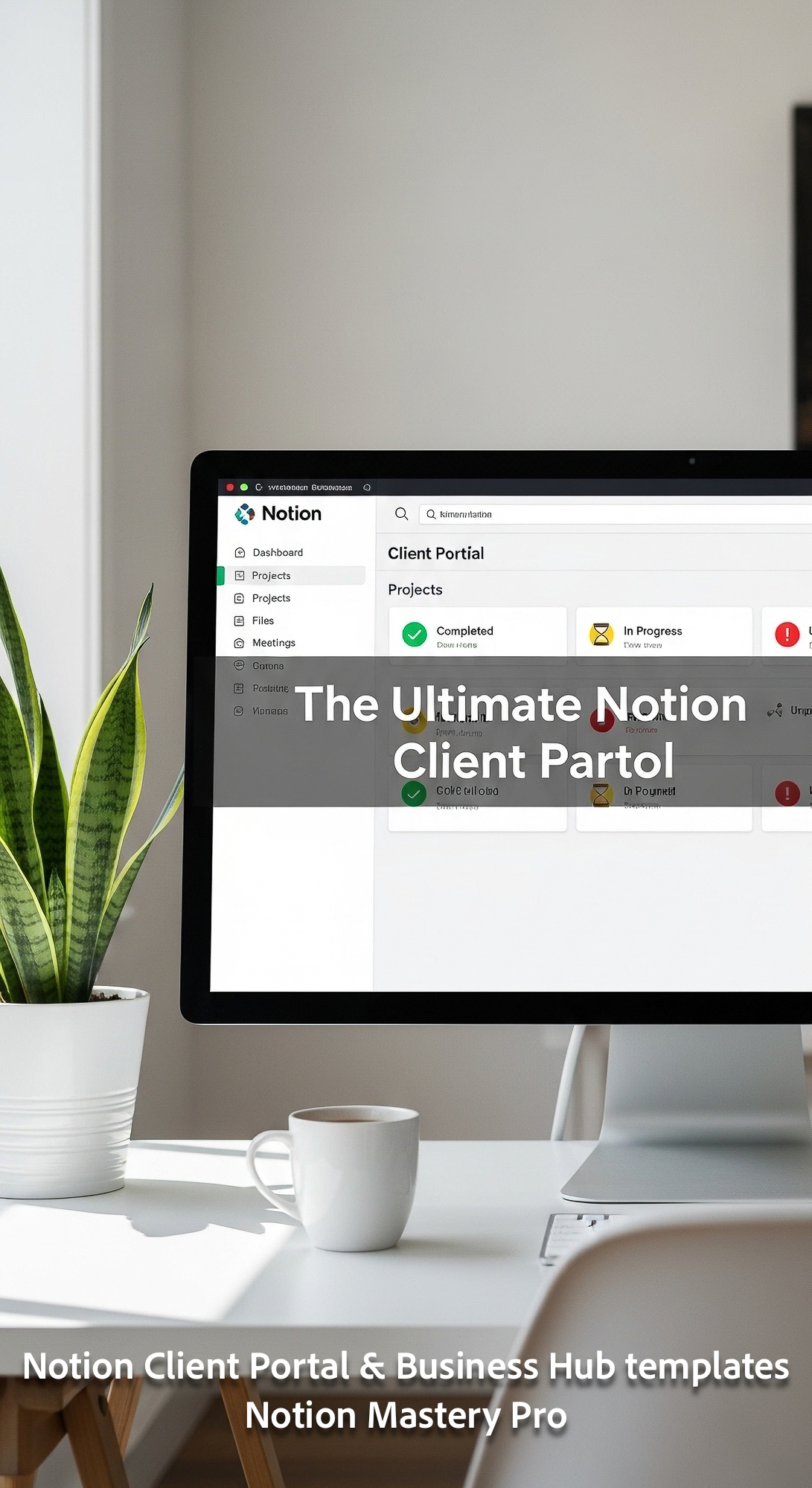 1 Realistic minimalist home office with a large monitor showing a Notion client portal dashboard wit