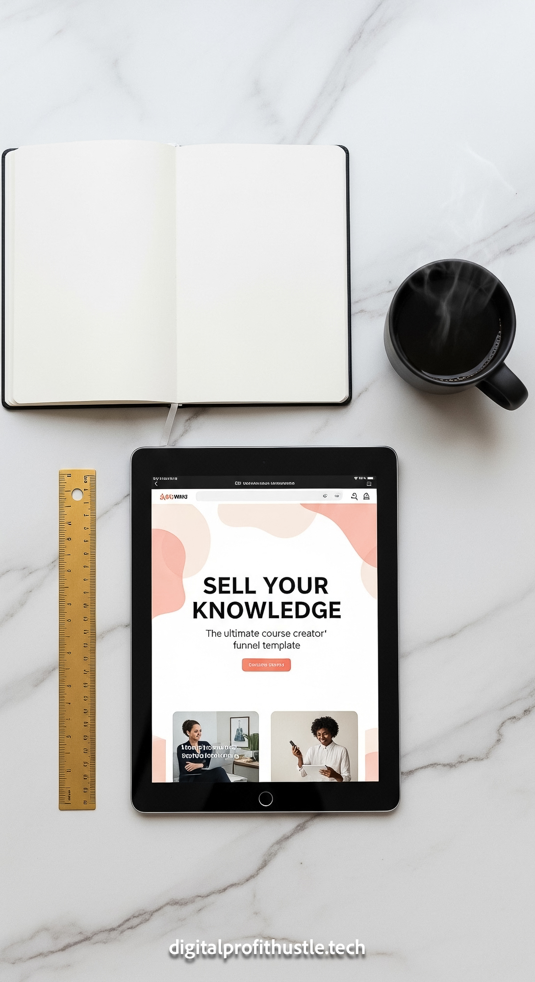 10 Overhead view of a tablet showing a sales page for a digital course a gold ruler a white notebook