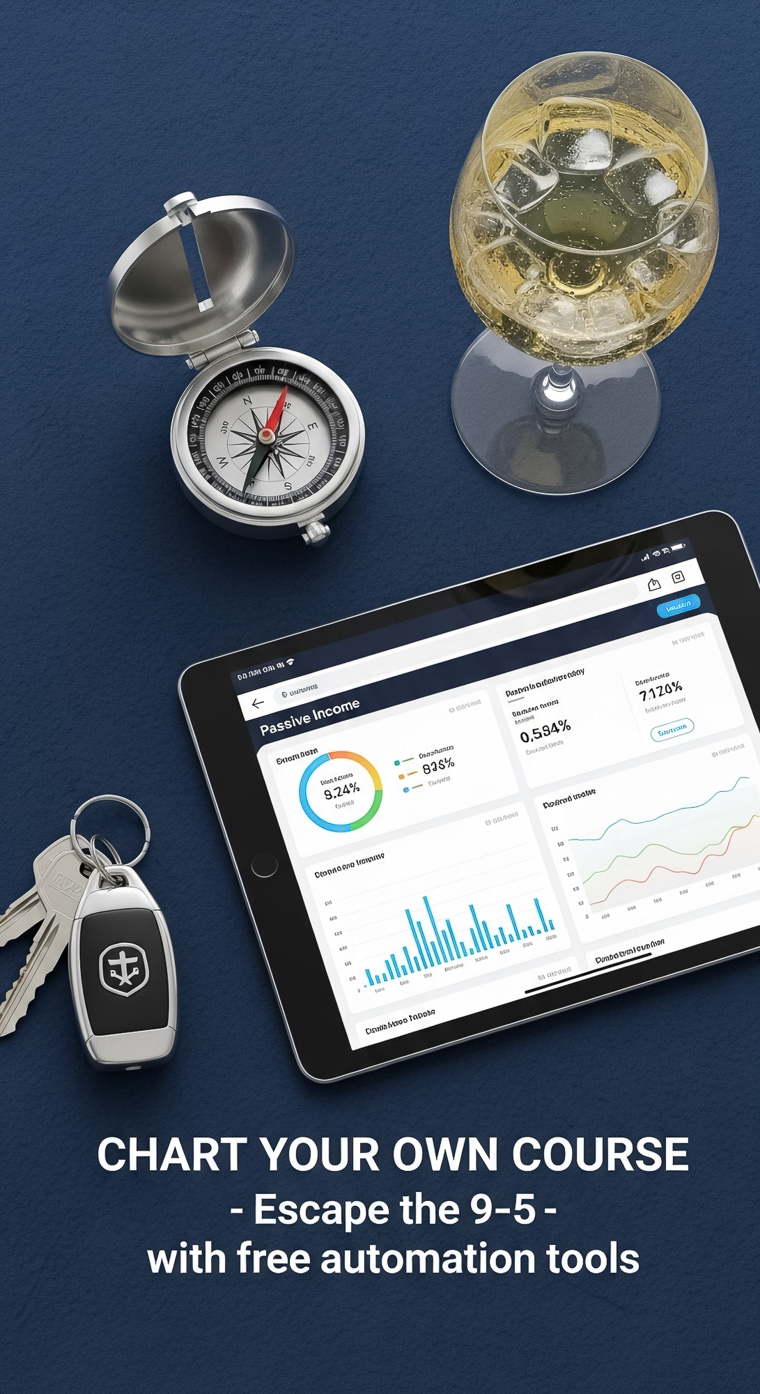 104 Topdown view of a tablet showing passive income stats a set of luxury yacht keys a silver compas