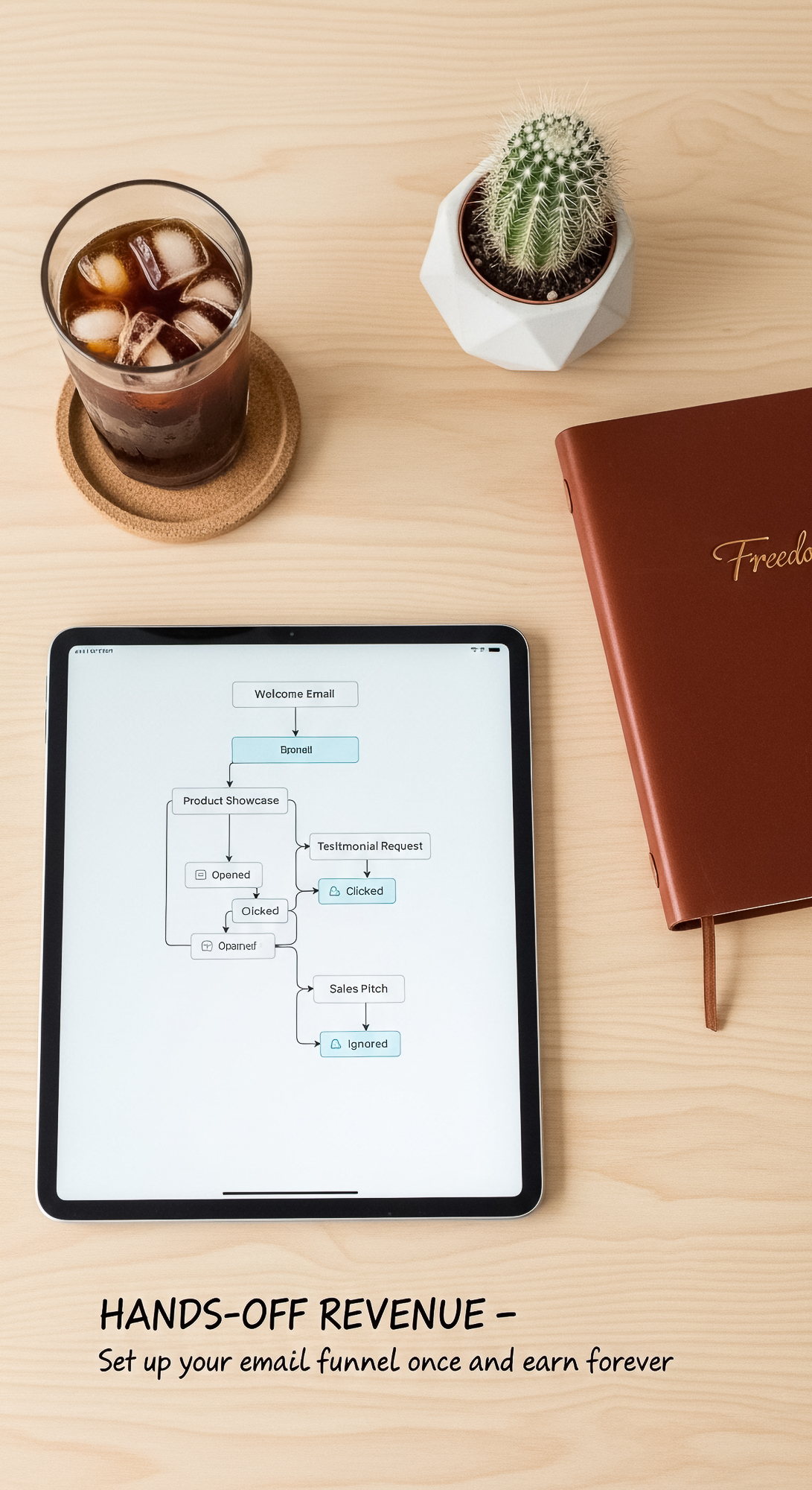 106 Overhead shot of an iPad showing an email automation sequence a Freedom leather journal a small