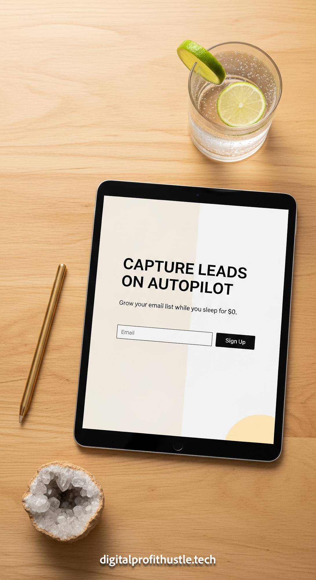 106 Overhead view of a tablet displaying a lead capture page a gold stylus a small crystal geode and