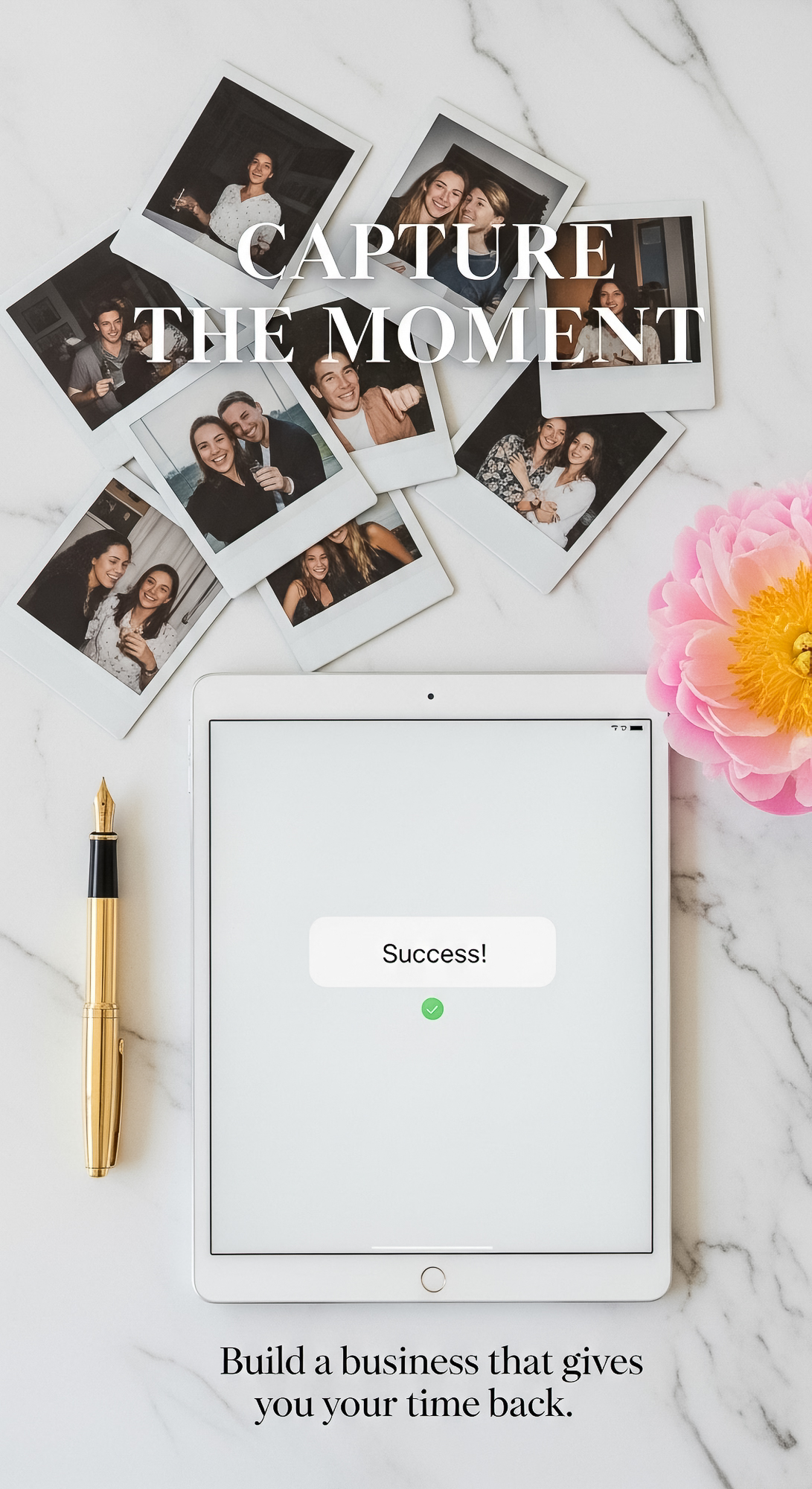 109 Flat lay of an iPad displaying a Success notification a gold fountain pen a scattered pile of po