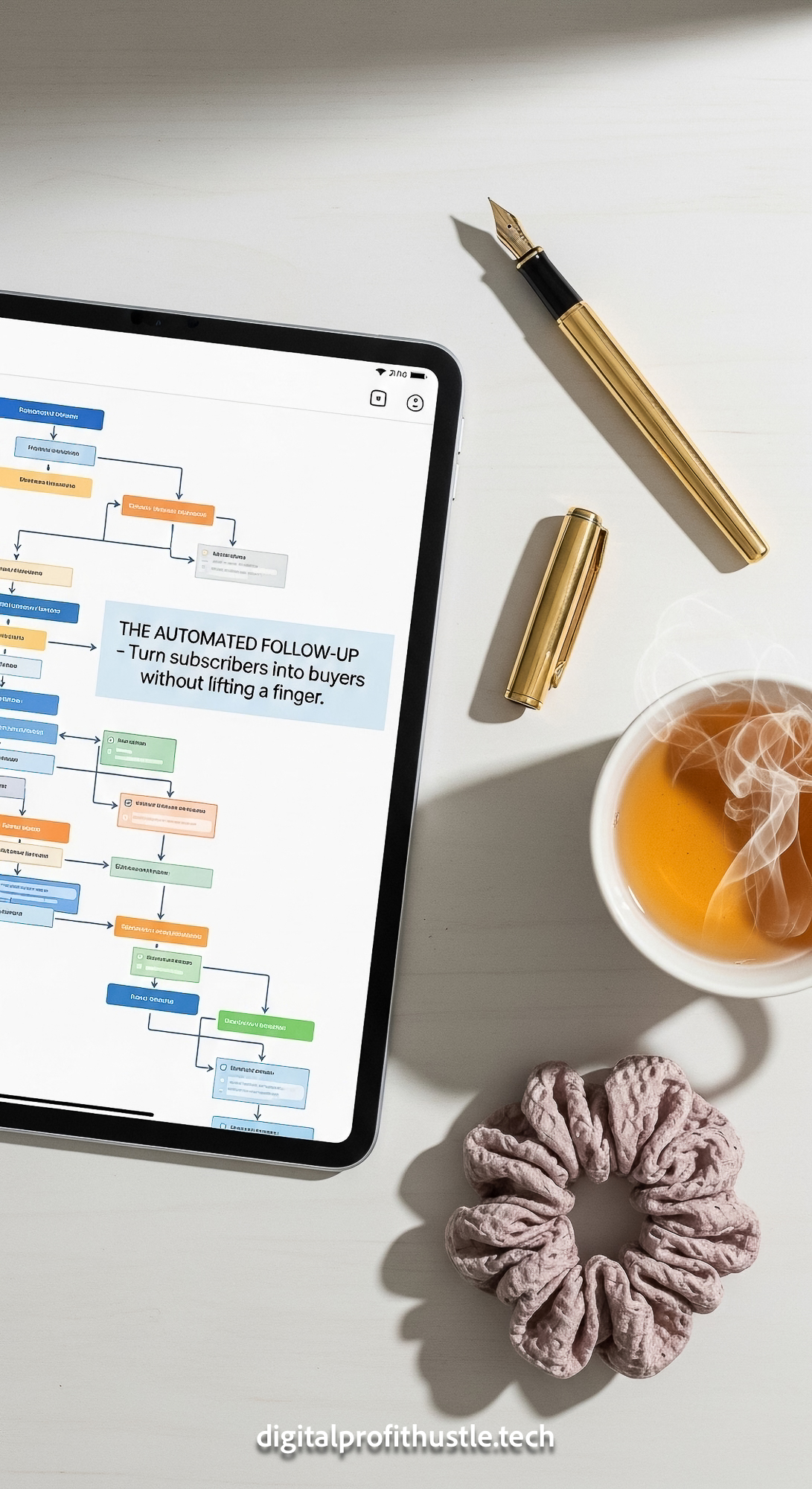 109 Flat lay of an iPad displaying an automated email sequence map a gold fountain pen a silk hair t