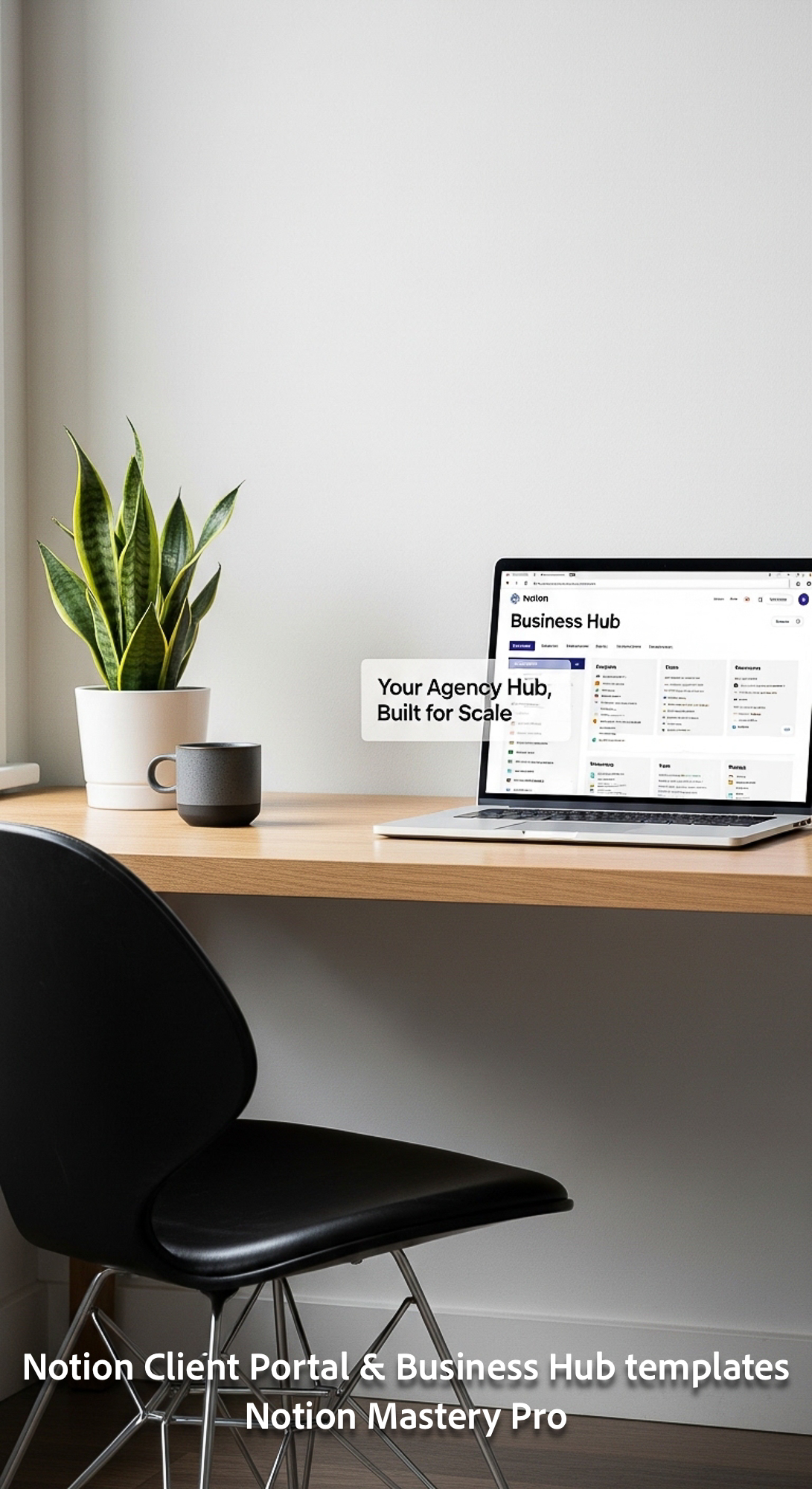 109 Minimalist desk with a designer chair and a laptop showing a Notion Business Hub Overlay Your Ag