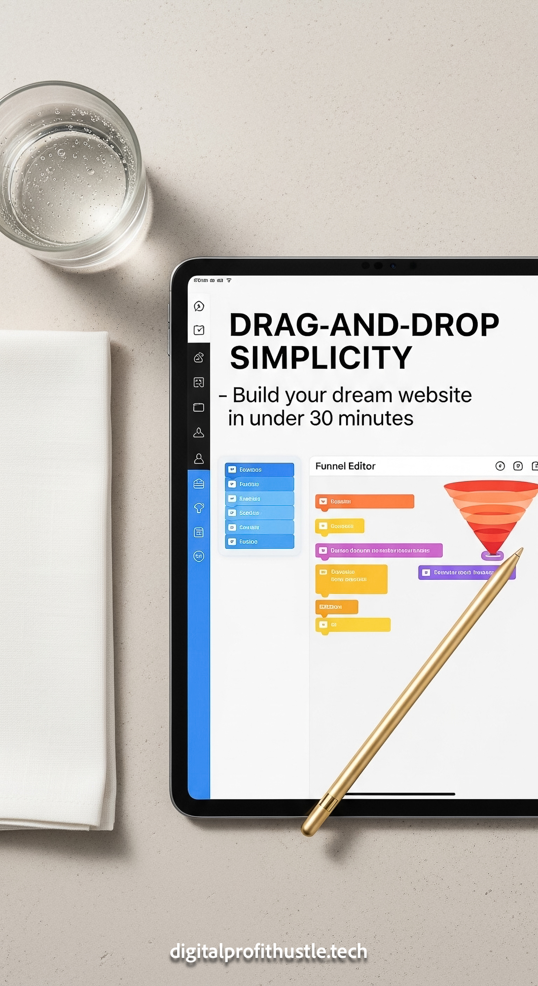 115 Flat lay of an iPad on a light beige textured surface showing a funnel editor a gold stylus a wh