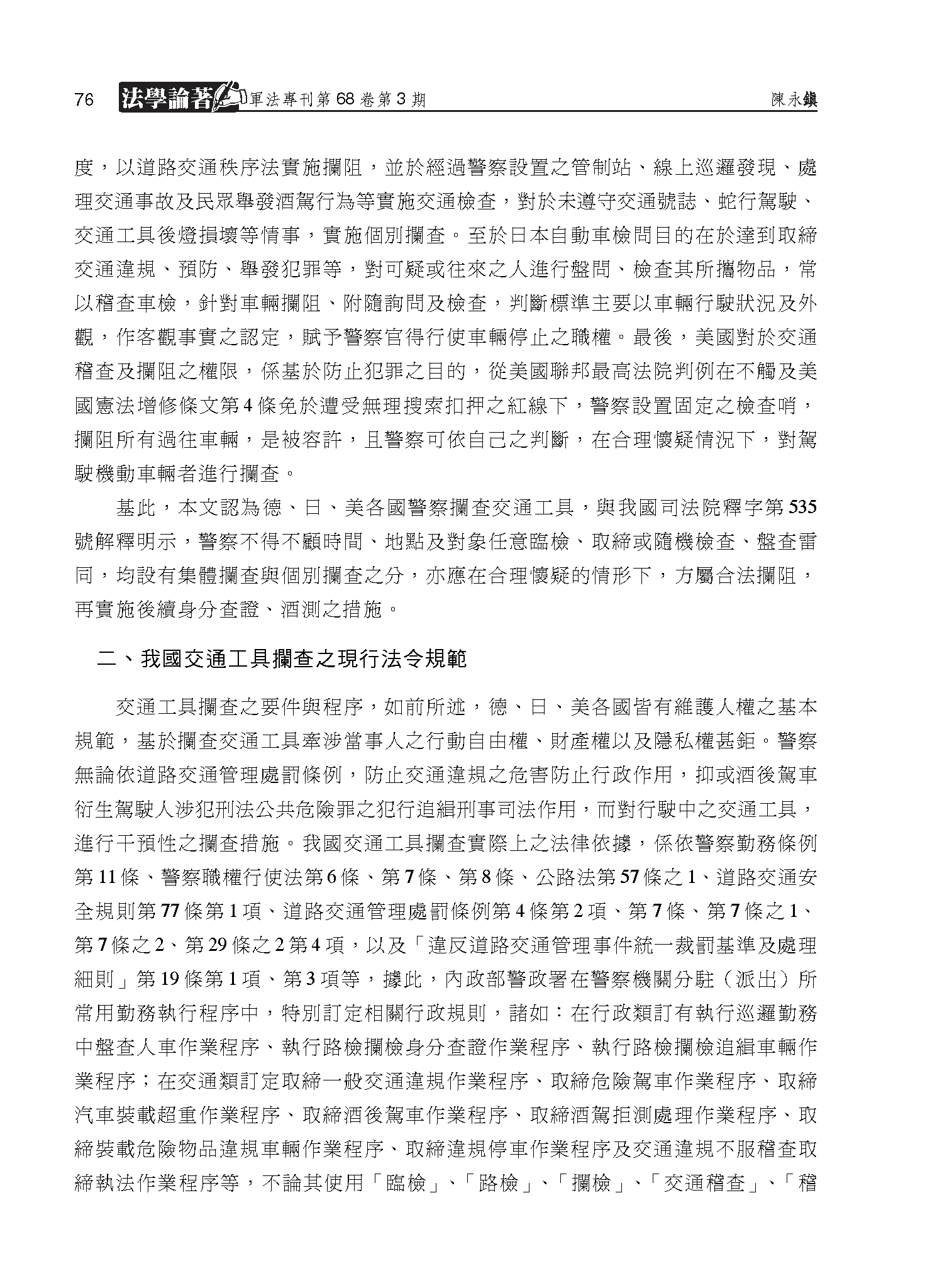 11(頁76):陳永鎮:〈警察執行攔查交通工具適法性之探討〉《軍法專刊》卷68期3(2022.06):頁66--92▲