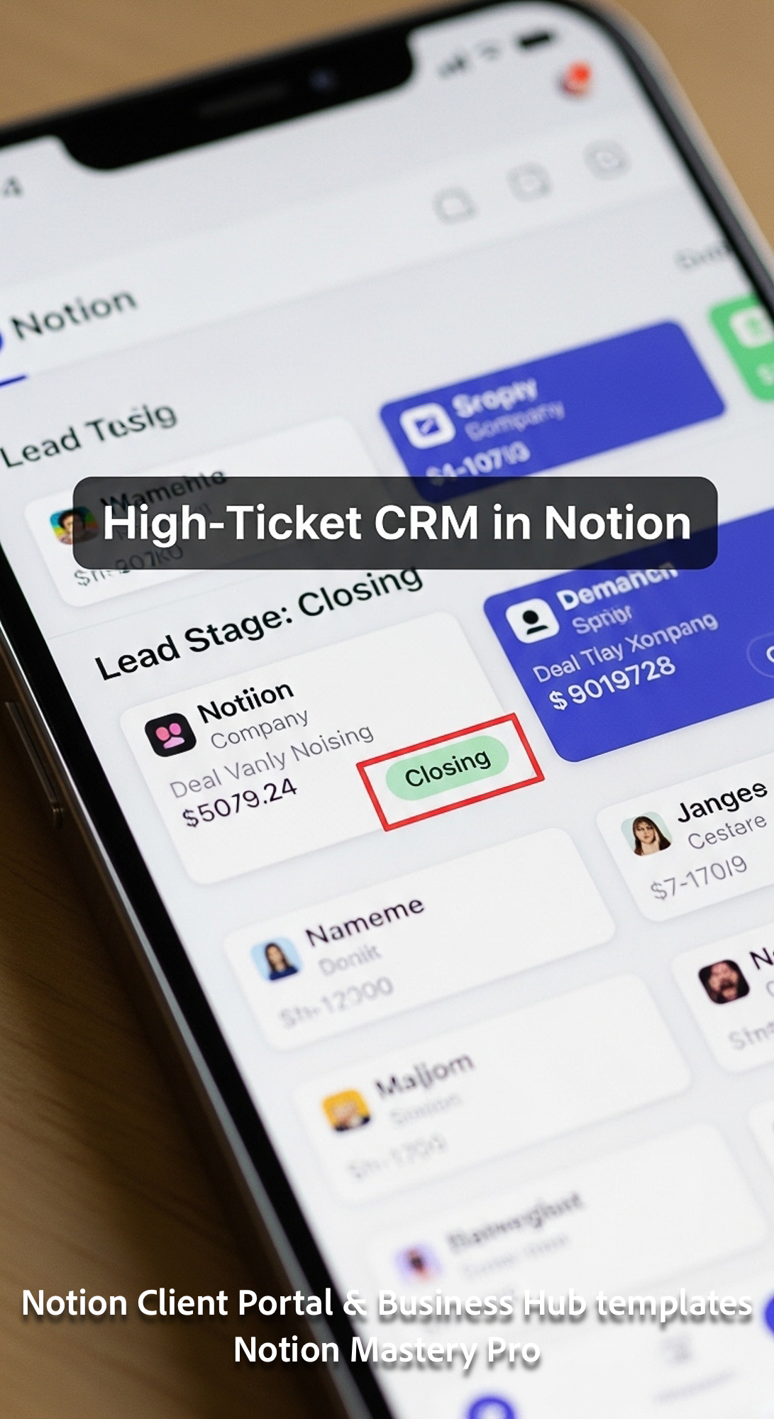 124 Closeup of a highend smartphone displaying a Notion CRM with Lead Stage Closing visible Overlay