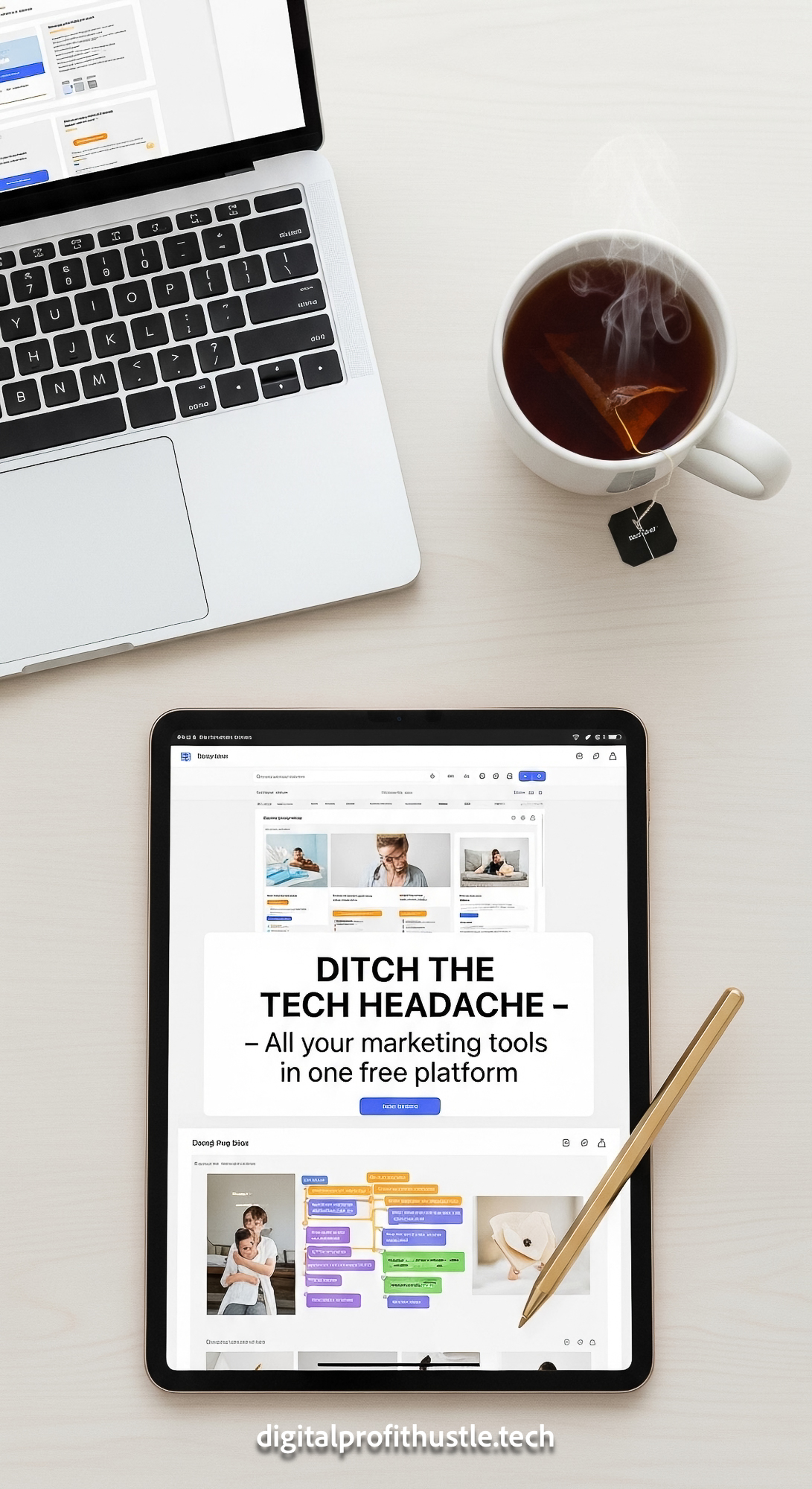 124 Topdown view of an iPad showing a landing page editor a gold stylus a white laptop and a ceramic