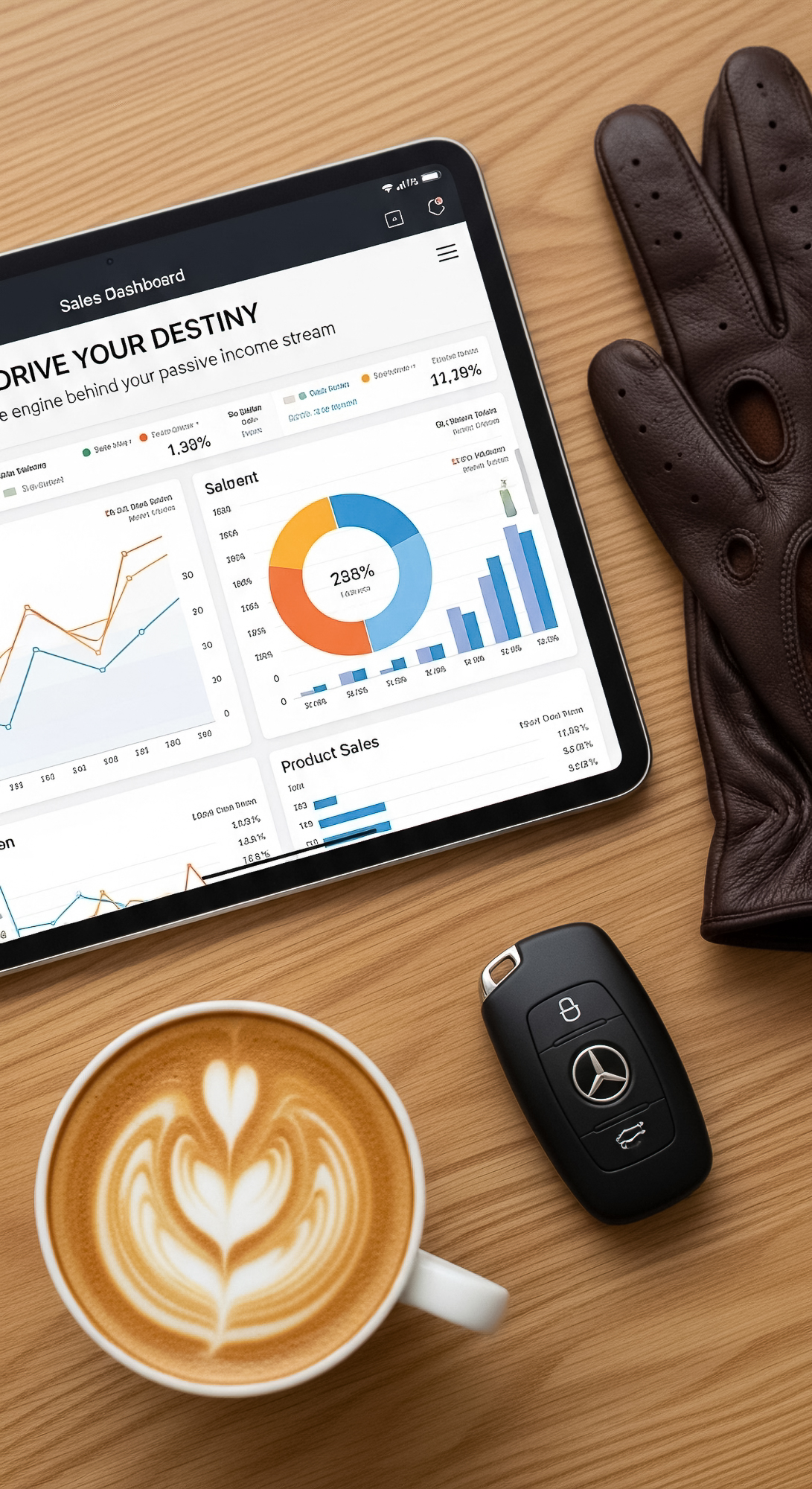 124 Topdown view of an iPad showing a sales dashboard a pair of leather driving gloves a luxury car