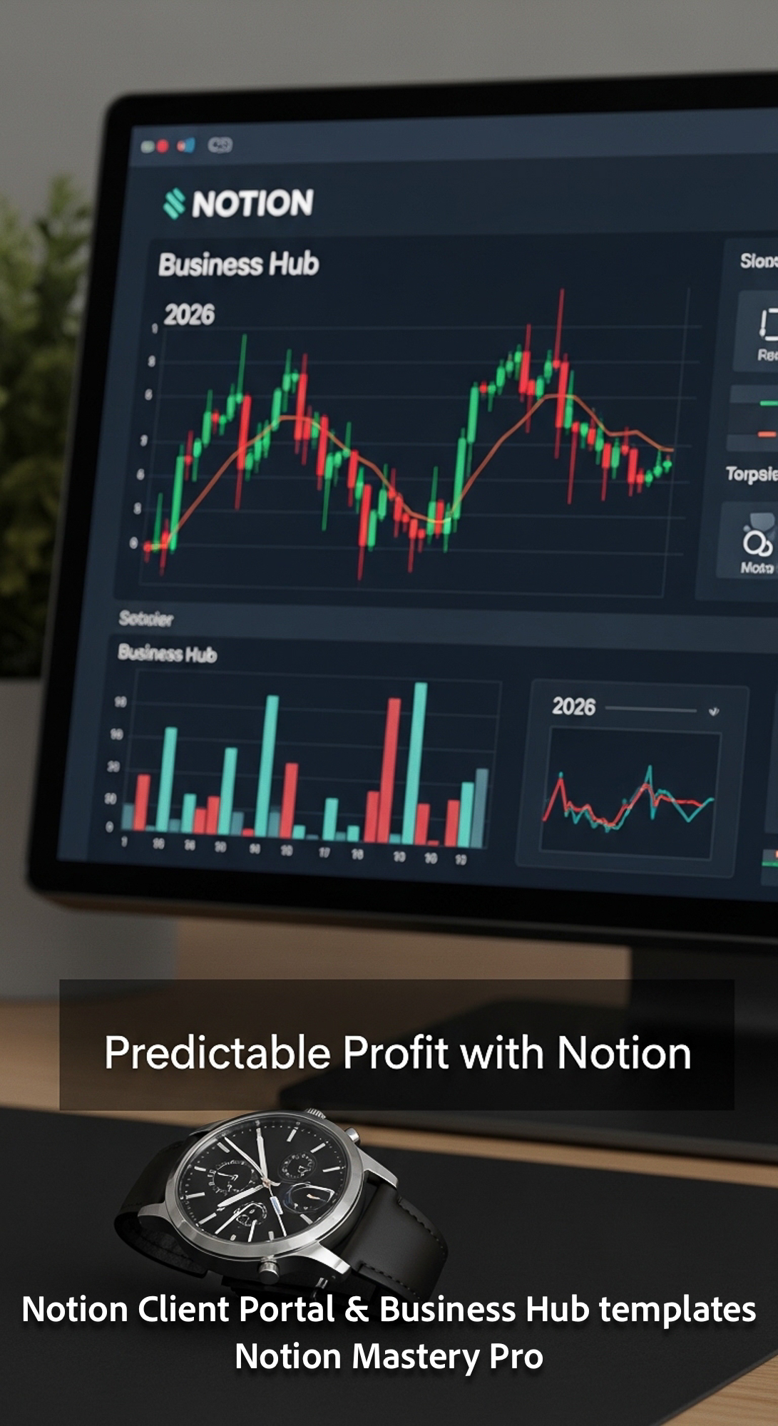 129 Closeup of a designer watch on a desk next to a screen showing a Notion Business Hub with 2026 f