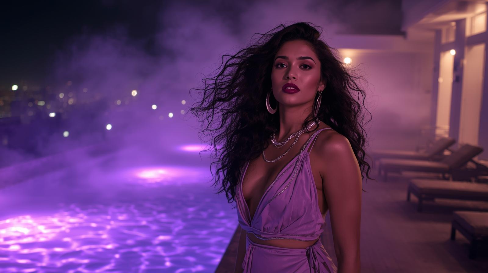 14. A seductive Indian vocalist with cascading curls and plum ombré lips, in a lavender slip dress w