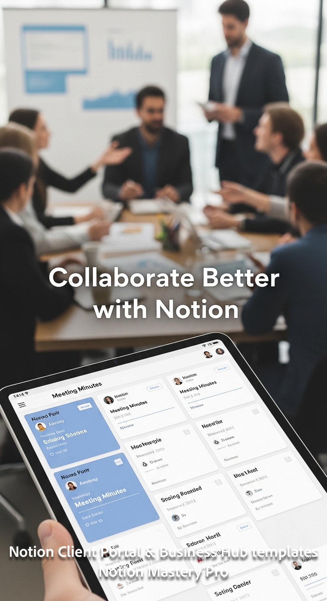 142 Blurred background of a team meeting foreground tablet showing a Notion Meeting Minutes gallery