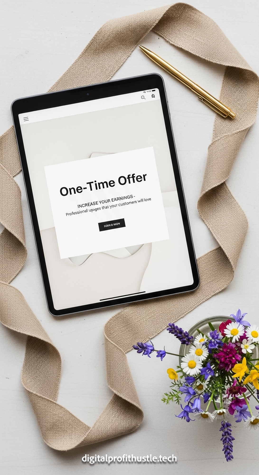 143 Flat lay of an iPad displaying a OneTime Offer page a gold pen a tan linen ribbon and a small va
