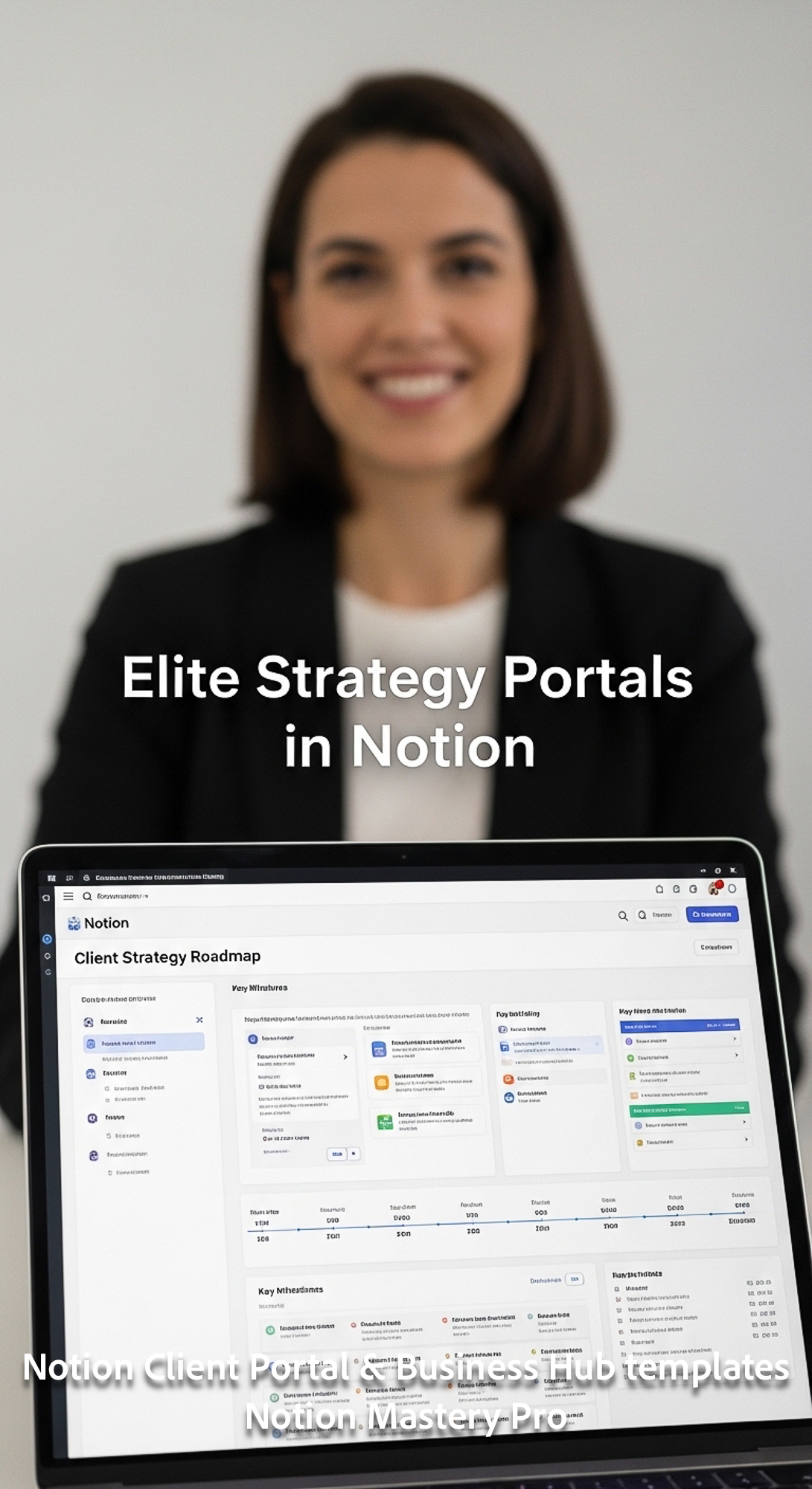 146 Blurred background of a successful consultant foreground screen with a Notion Client Strategy ro