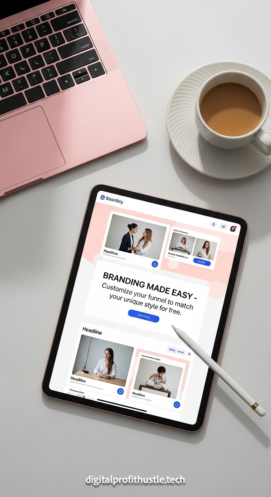 154 Topdown view of an iPad showing a landing page editor a gold stylus a pink laptop and a ceramic