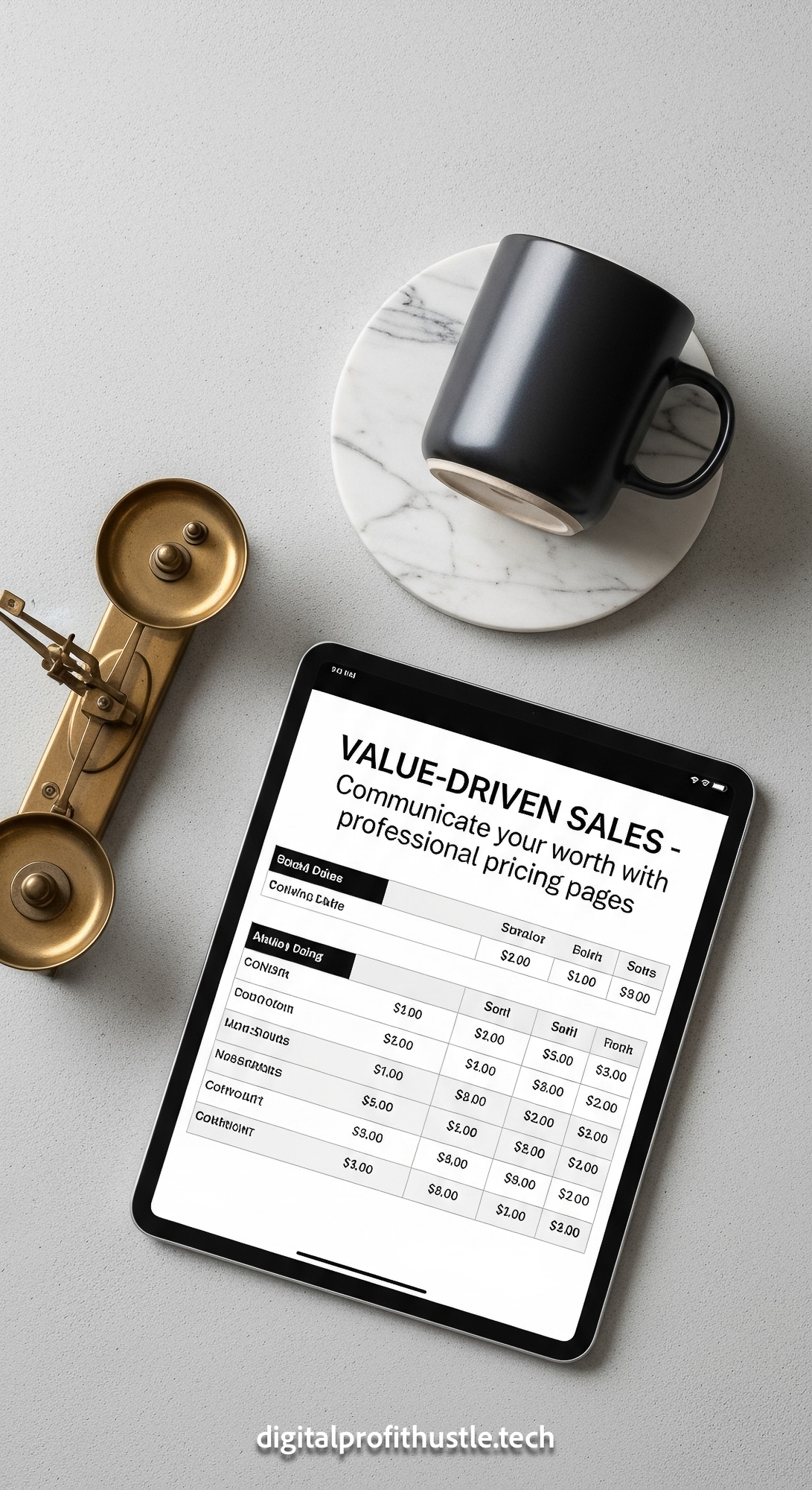 163 Flat lay of an iPad displaying a pricing table a set of vintage scales a white marble coaster an