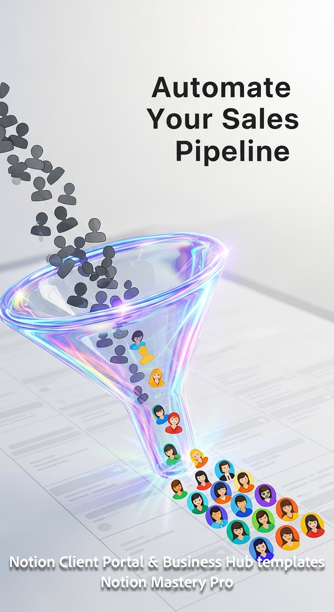 166 Abstract visualization of a funnel turning lead icons into client icons inside a Notion grid Ove