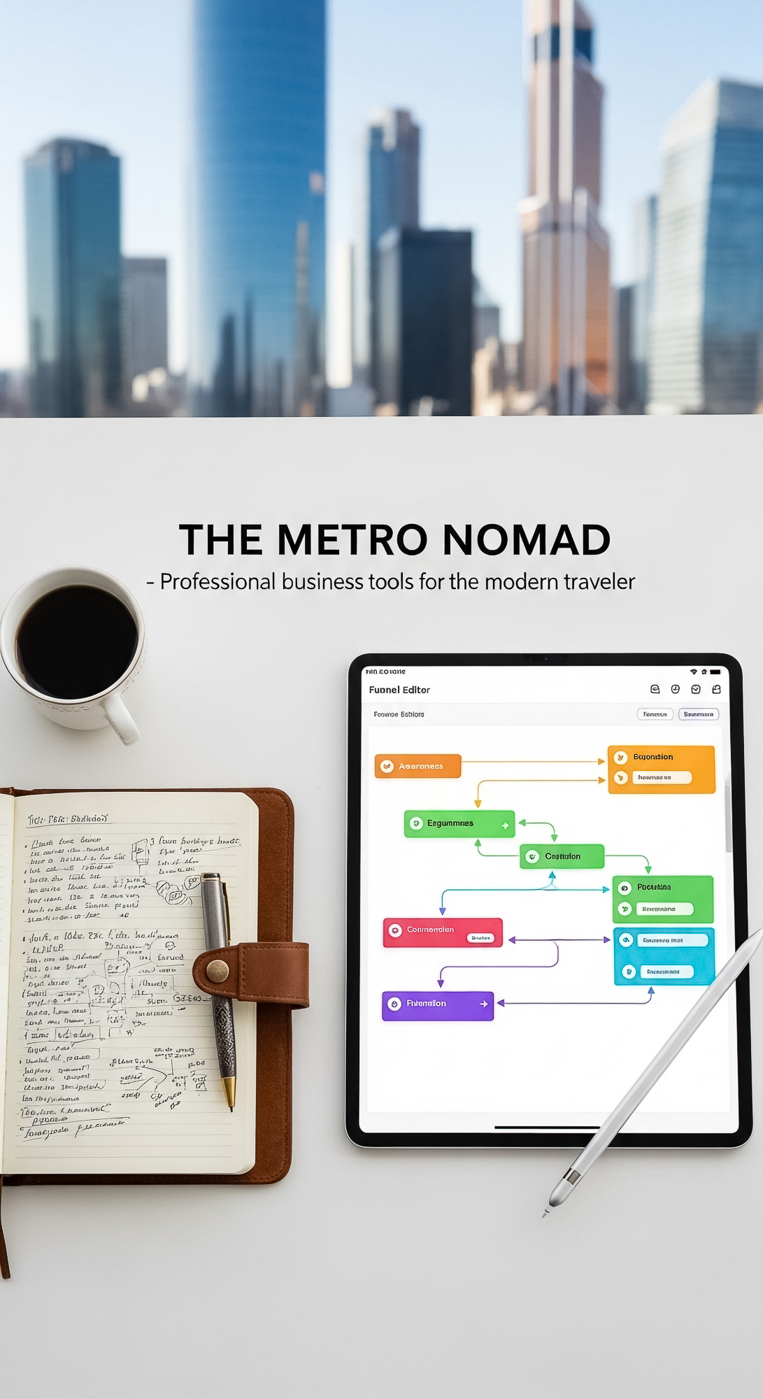 167 Topdown view of a tablet with a funnel editor a silver stylus a travelers notebook and a city sk