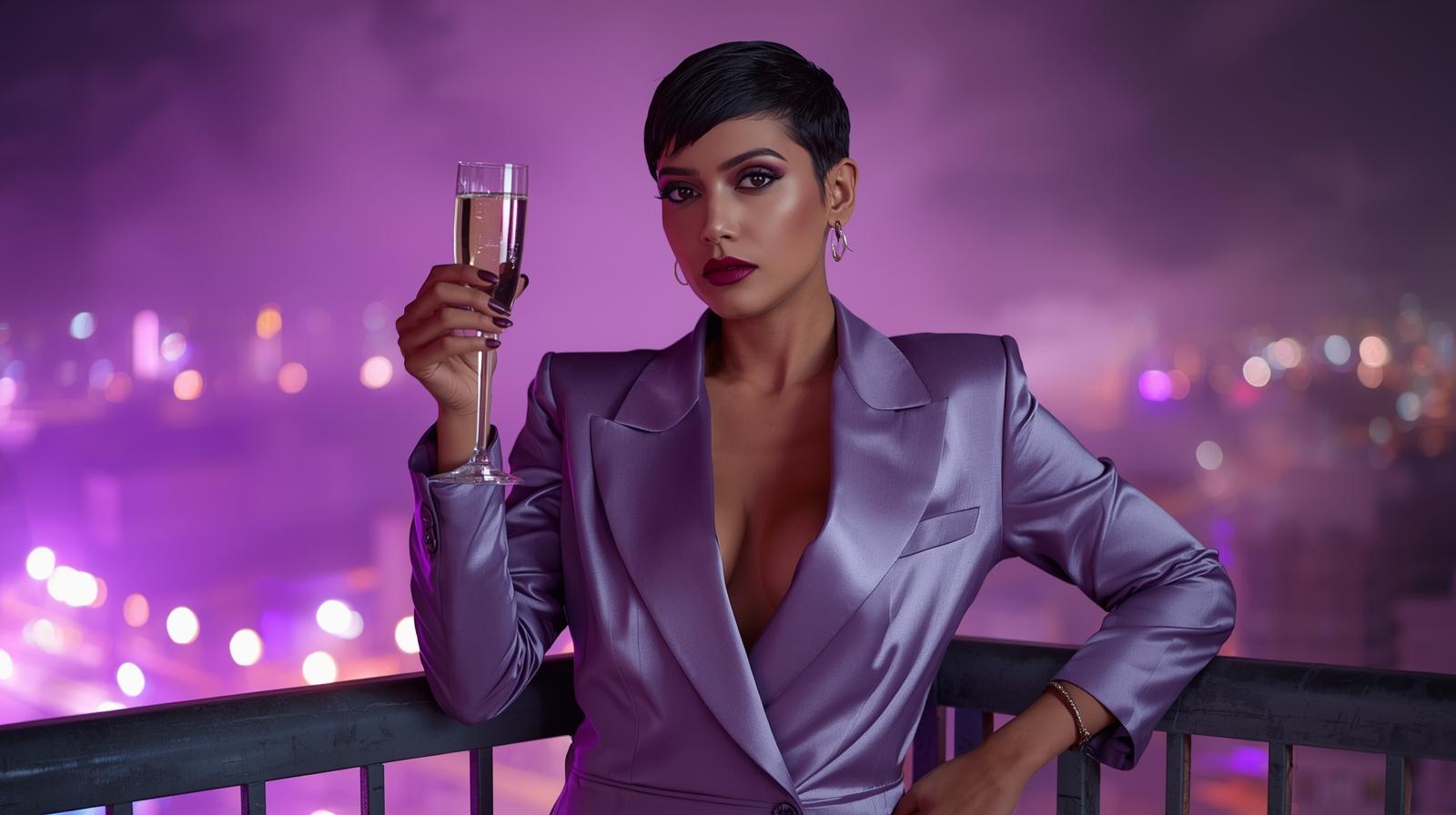 17. A chic Indian trendsetter with pixie cut and plum lipstick, wearing a lavender satin tuxedo and