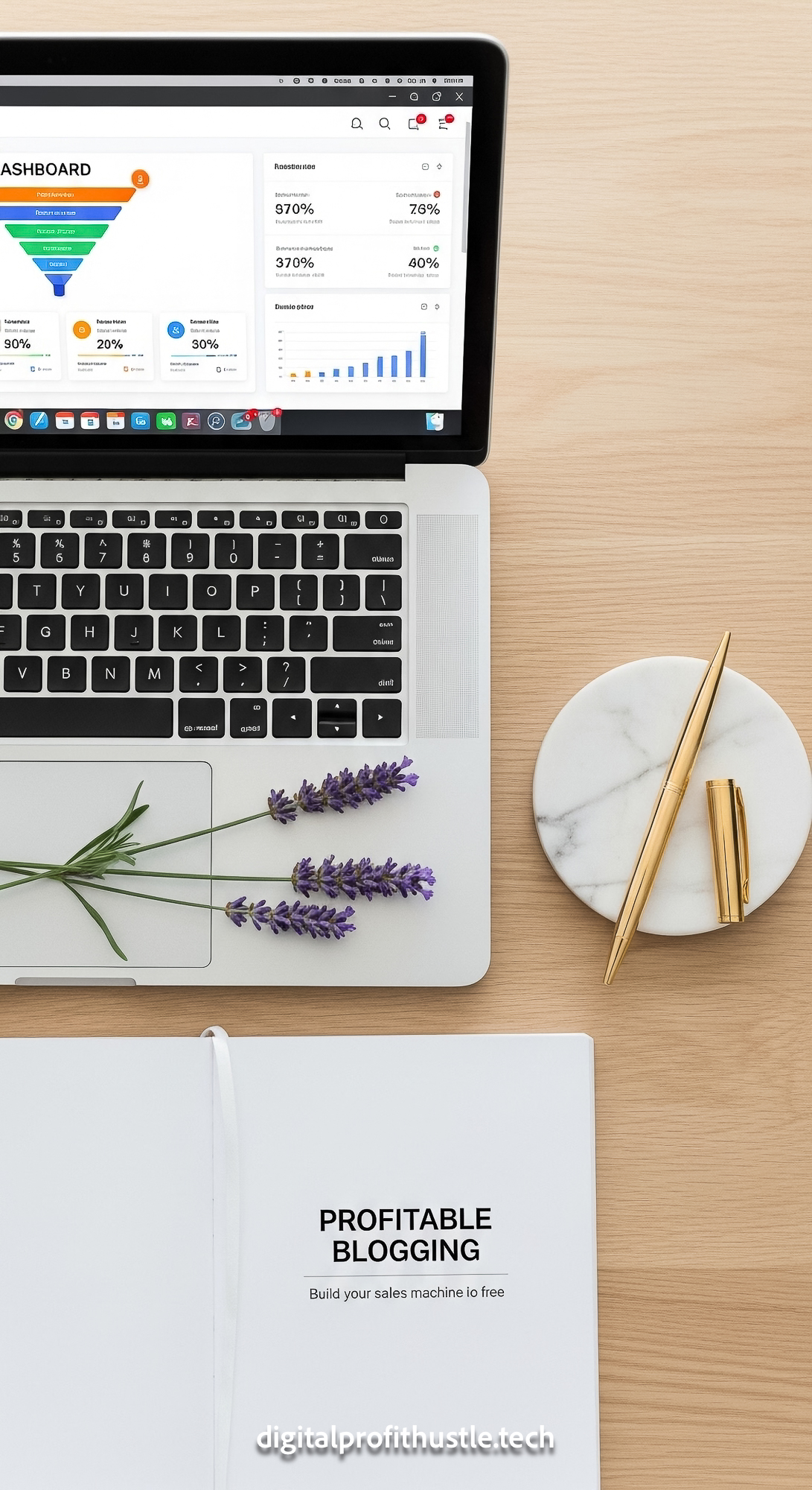 17 Flat lay of a MacBook displaying a funnel dashboard a gold luxury pen a white marble coaster and