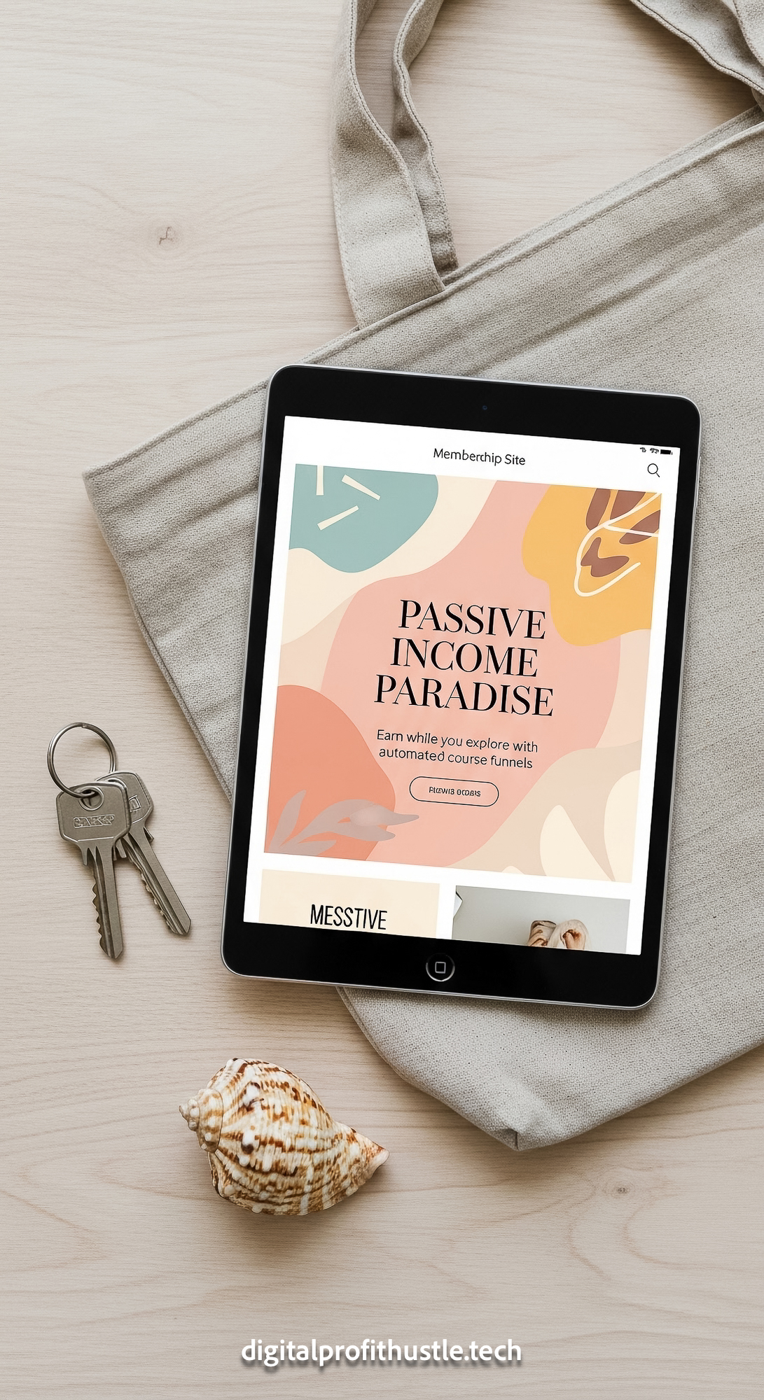 171 Flat lay of an iPad showing a membership site design a set of keys a linen beach bag and a shell