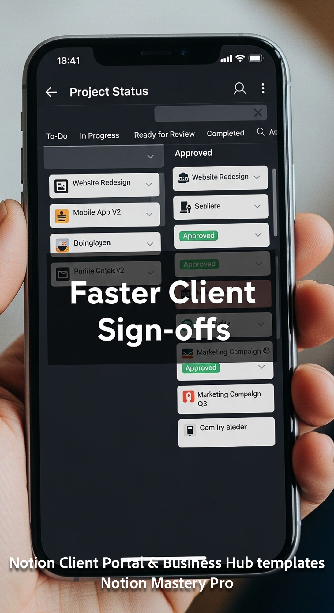 173 Closeup of a smartphone showing a Notion Project Status board with Approved status labels Overla