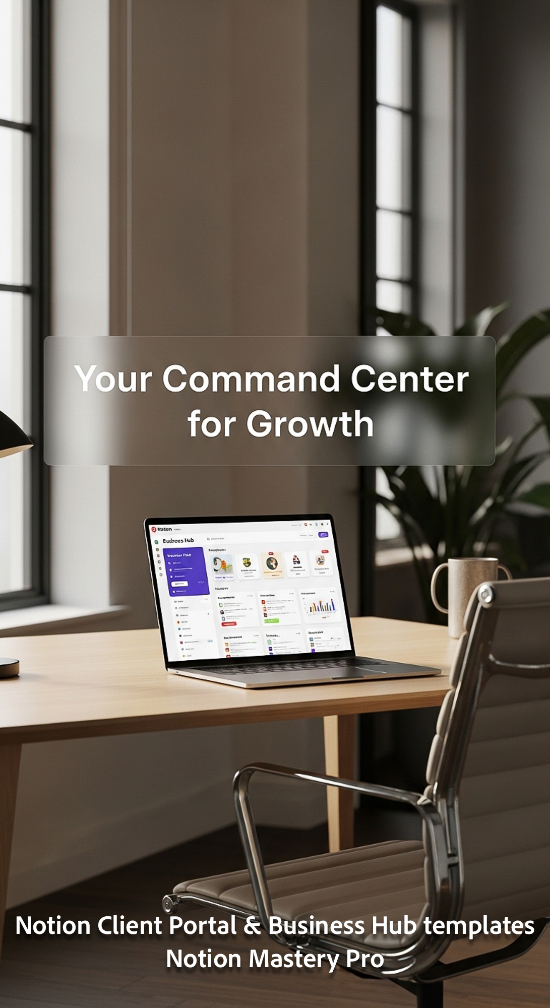 176 Minimalist desk with a designer chair and a laptop showing a Notion Business Hub dashboard Overl