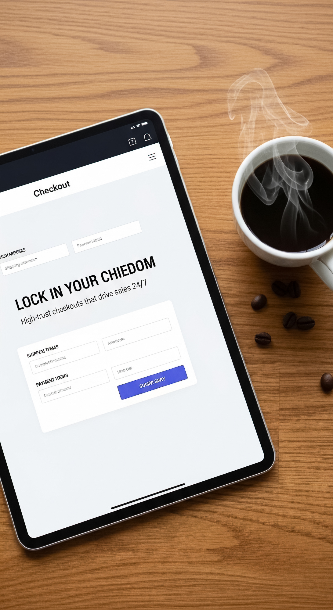179 Overhead view of a tablet showing a checkout page and a cup of coffee Text LOCK IN YOUR FREEDOM