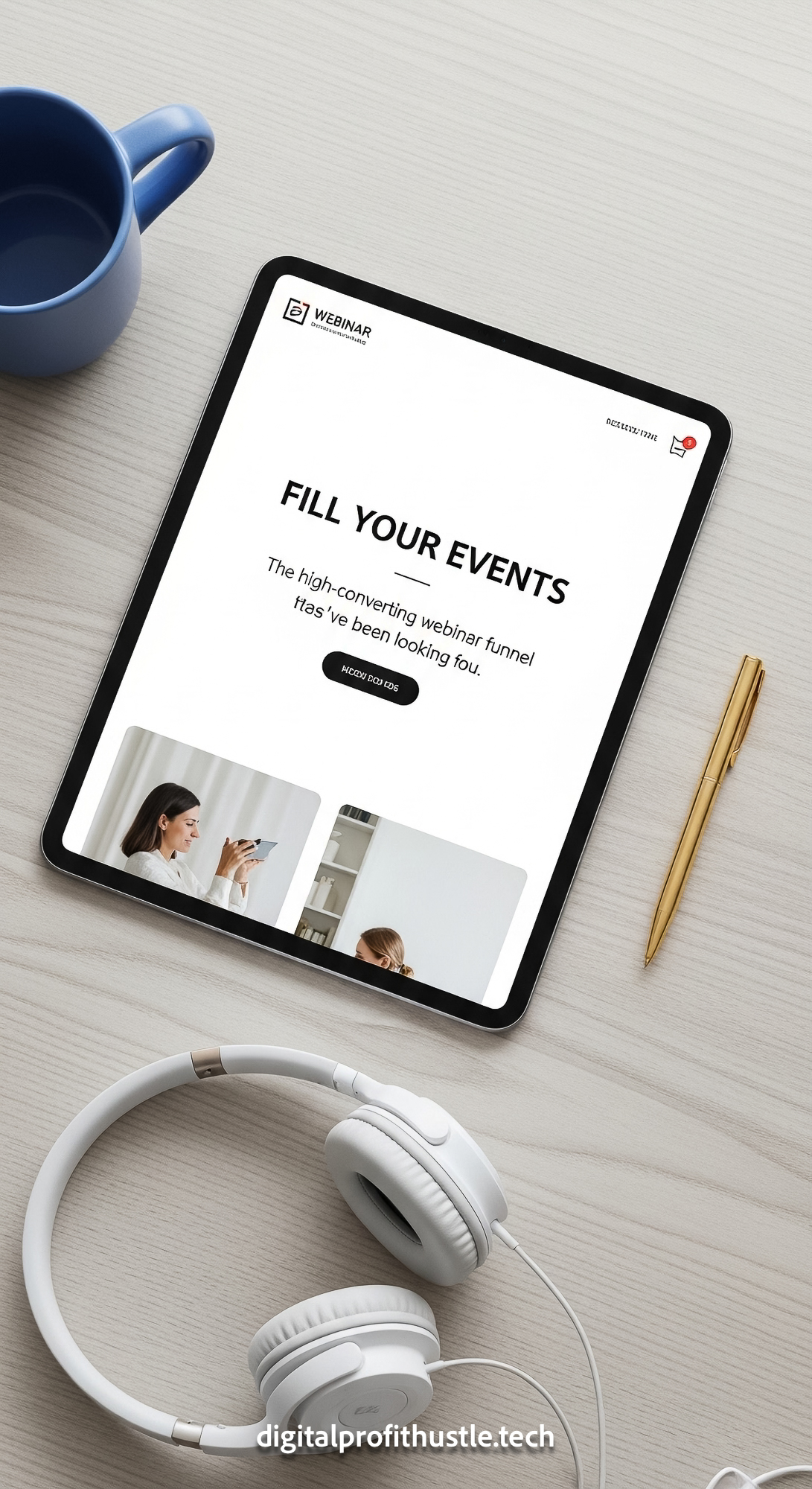 180 Overhead view of an iPad showing a webinar registration page a gold pen a white pair of headphon