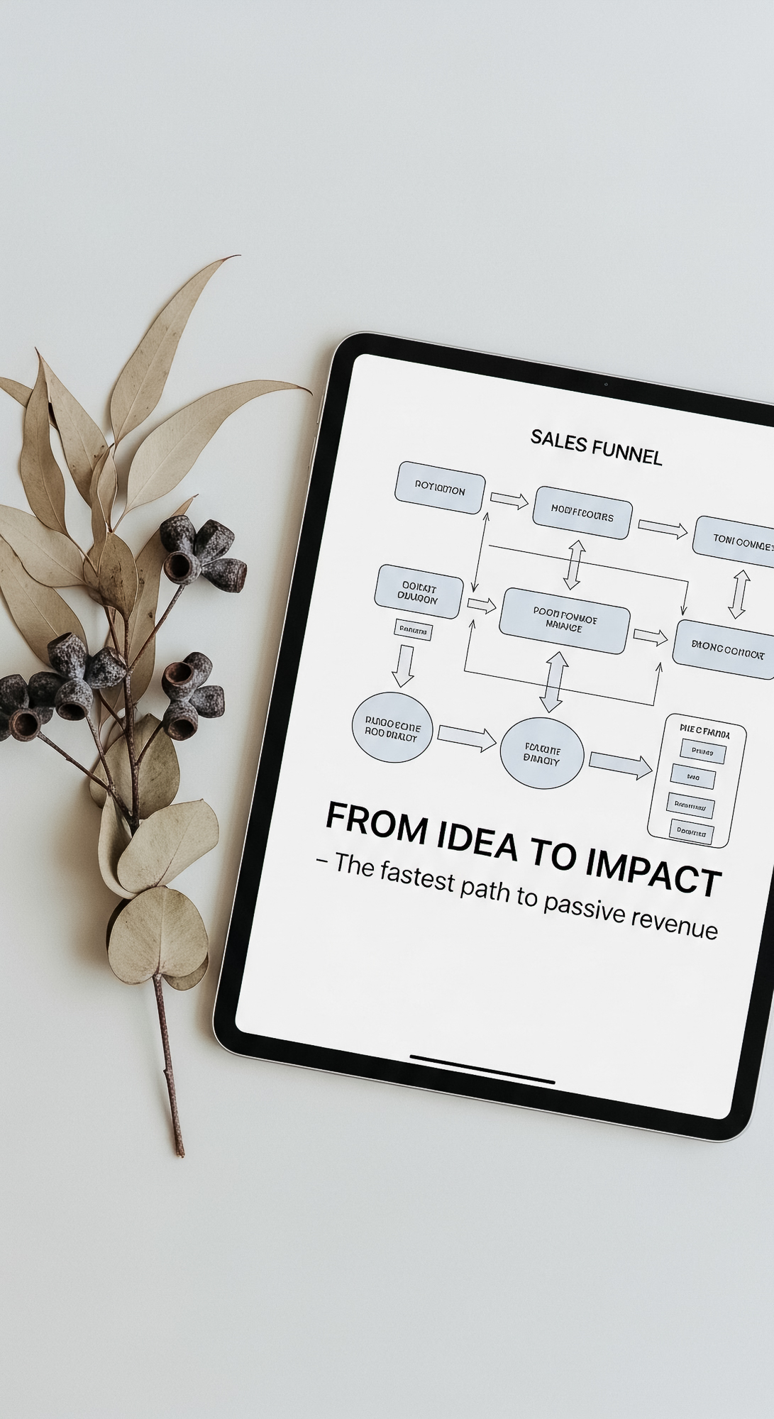 182 Flat lay of an iPad showing a sales funnel blueprint and a sprig of dried eucalyptus Text FROM I
