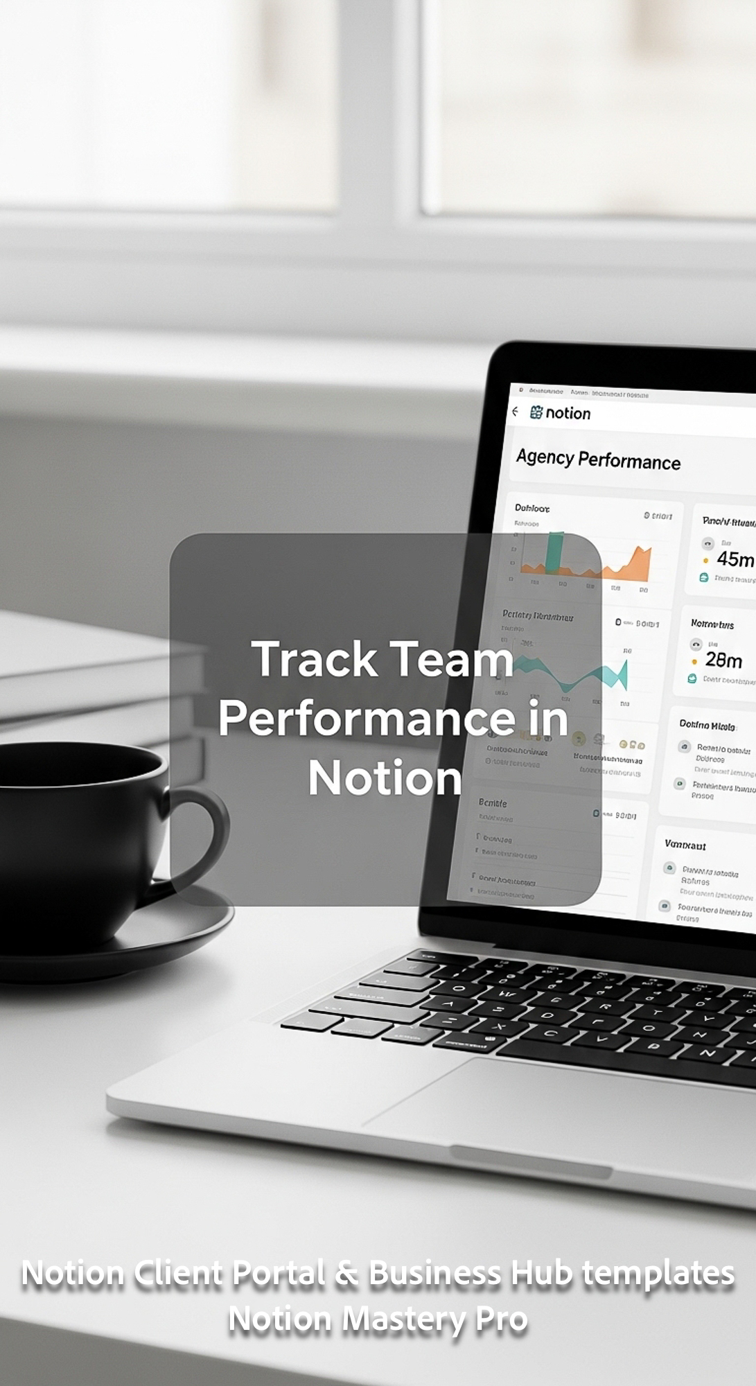 19 Minimalist desk with a black coffee cup and a laptop showing a Notion Agency Performance board Ov