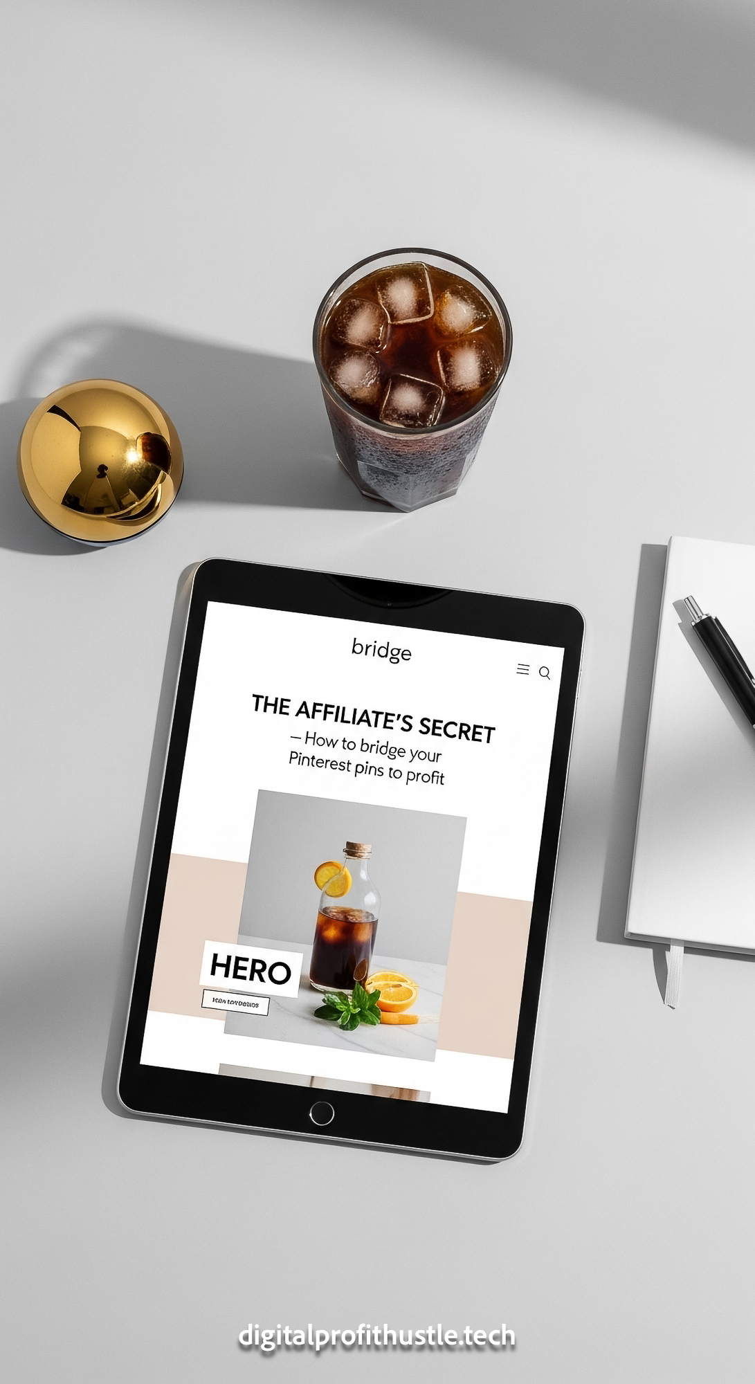 19 Overhead flat lay of a tablet with a bridge page design a gold paperweight a small white notebook