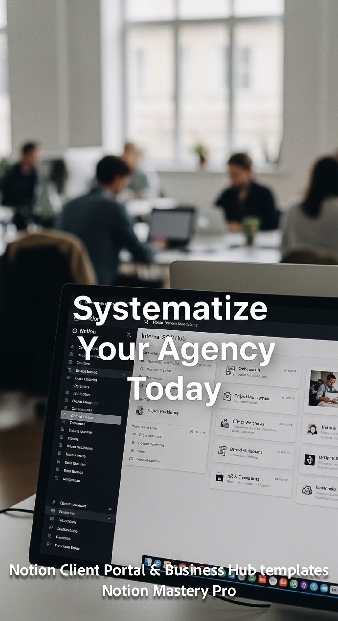 191 Blurred modern office background foreground monitor showing a Notion Internal SOP hub Overlay Sy