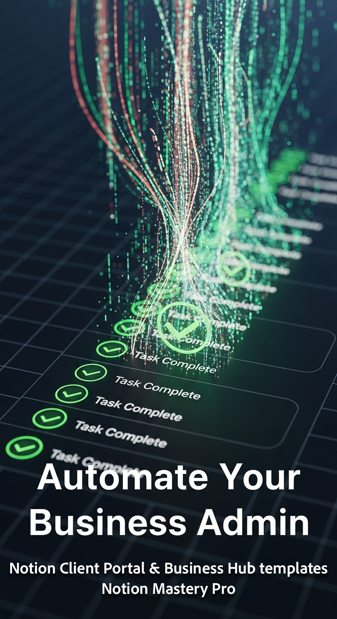 192 Abstract visualization of data streams transforming into Task Complete icons in a Notion list Ov