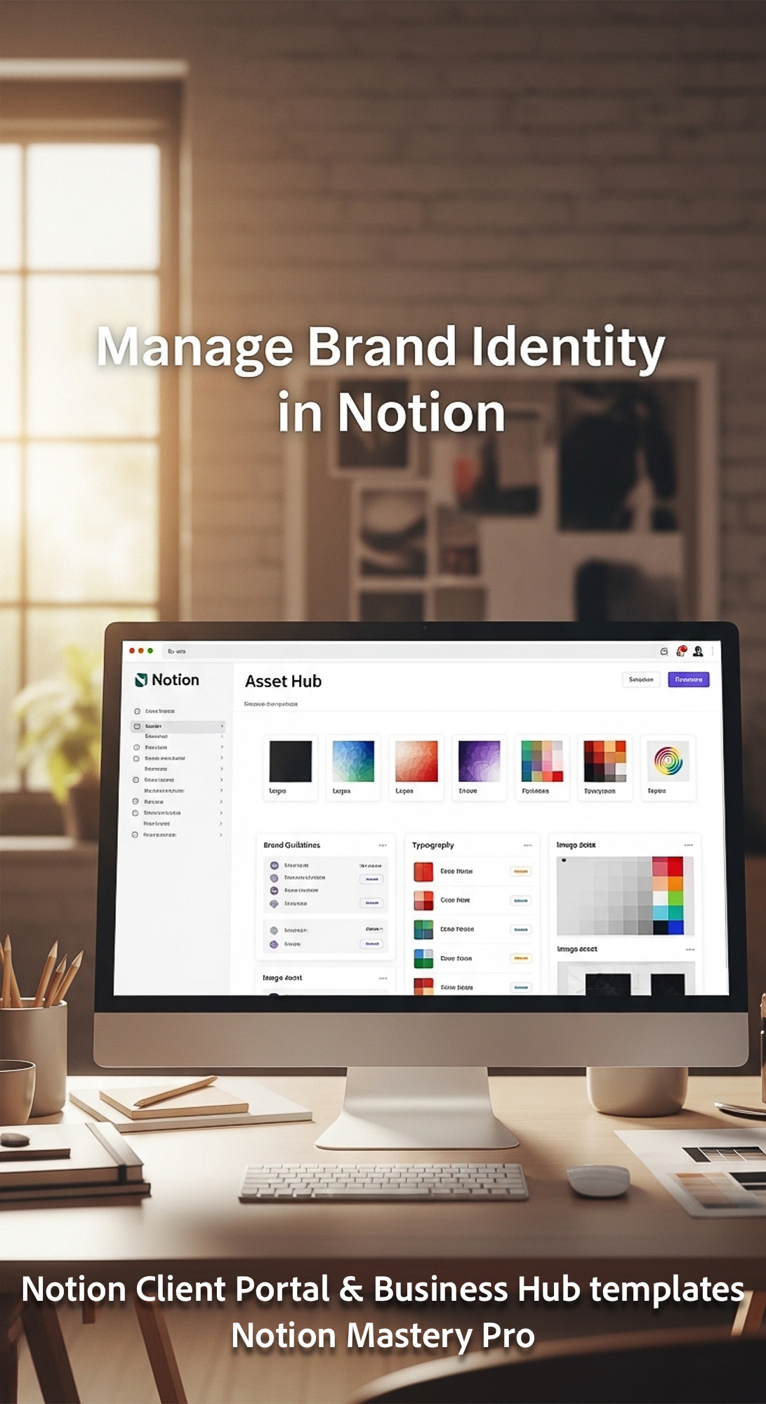 199 Blurred background of a designer studio foreground monitor showing a Notion Asset Hub Overlay Ma