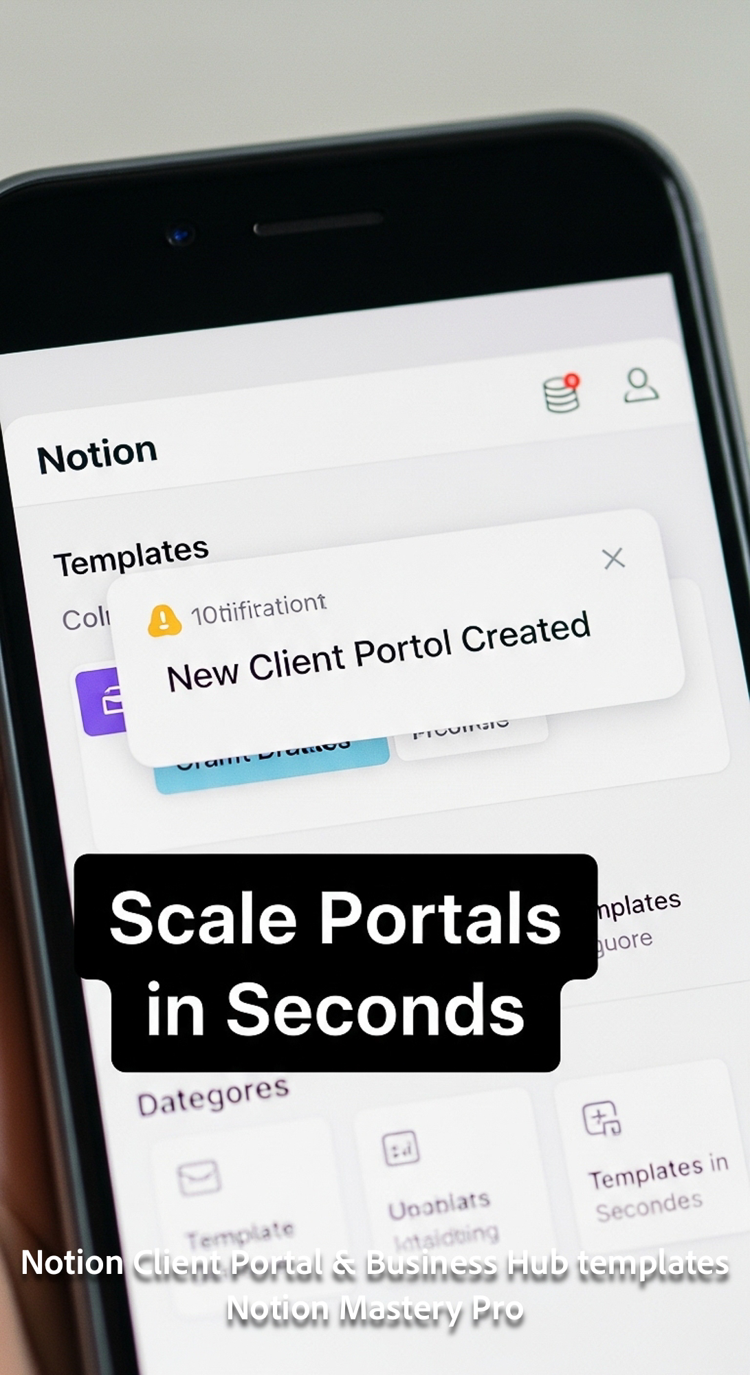 20 Closeup of a smartphone notification New Client Portal Created over a Notion Templates background
