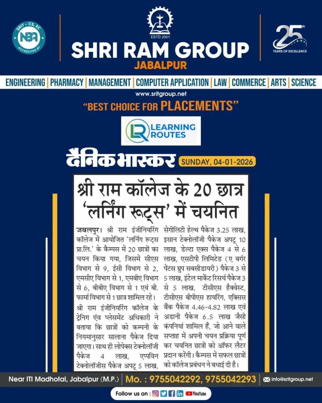 20 Students of Shri Ram Group Jabalpur Placed at Learning Routes Featured in Dainik Bhaskar