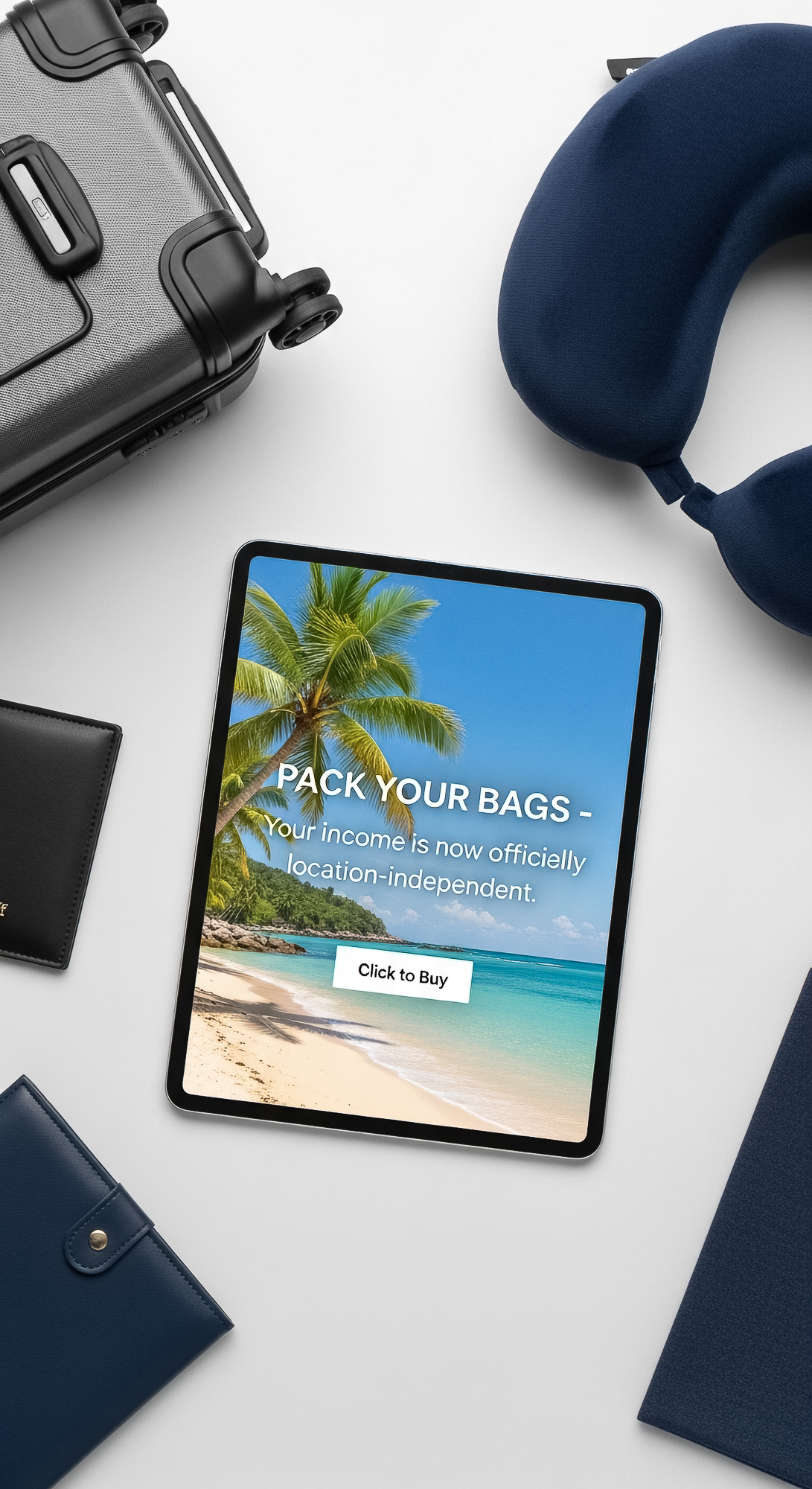 20 Topdown shot of an iPad showing a Click to Buy button a suitcase a passport holder and a neck pil